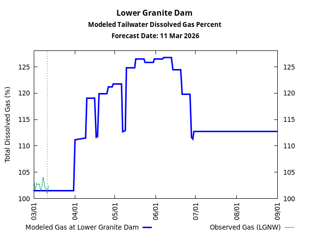 Total Dissolved Gas Percent: Observed Data at Lower Granite Dam thru 11 Mar 2026