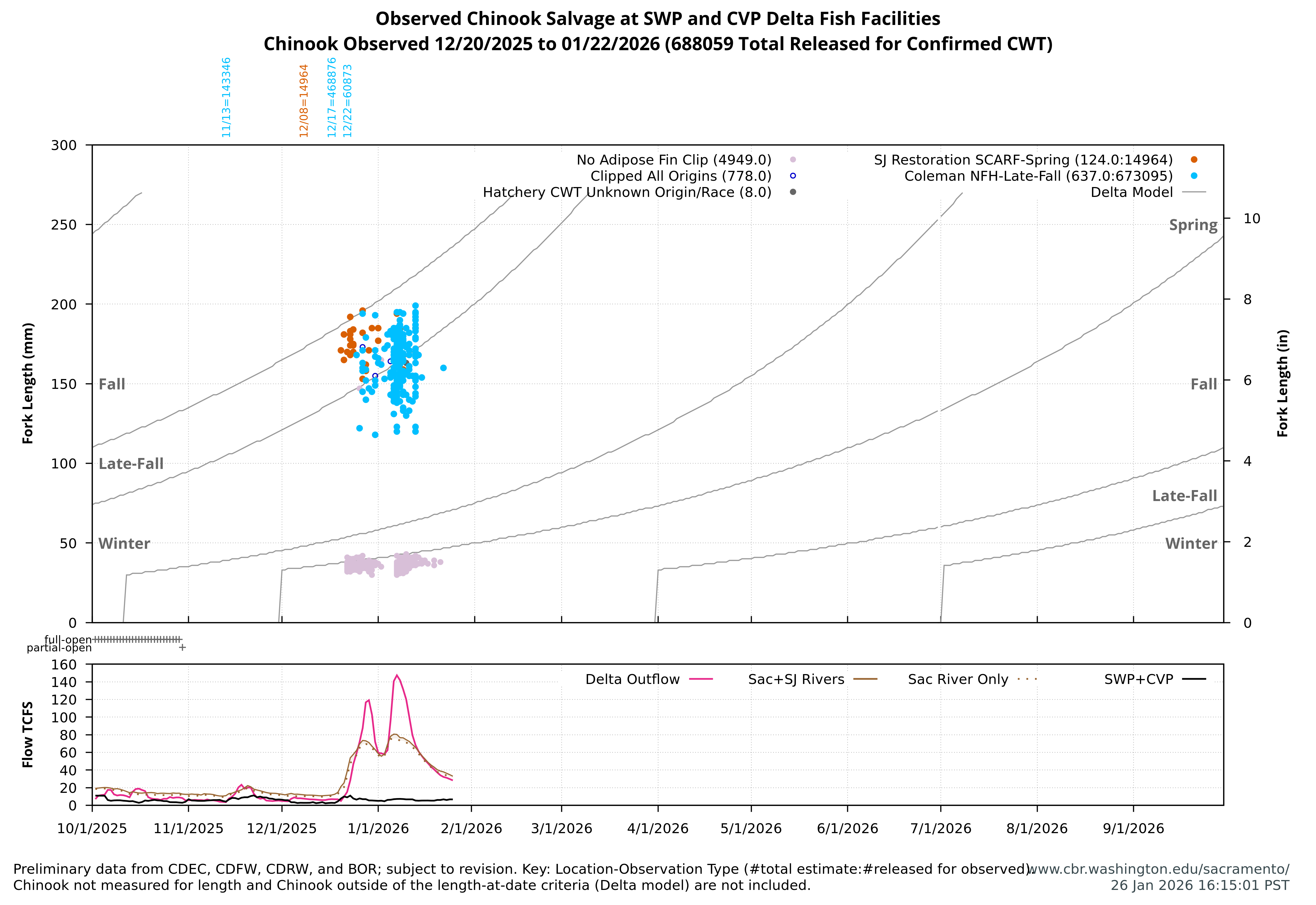 Observed Chinook Salvage at SWP and CVP Delta Fish Facilities, Chinook Observed 12/20/2025 to 01/22/2026 (688059 Total Released for Confirmed CWT) with Delta and River Flow