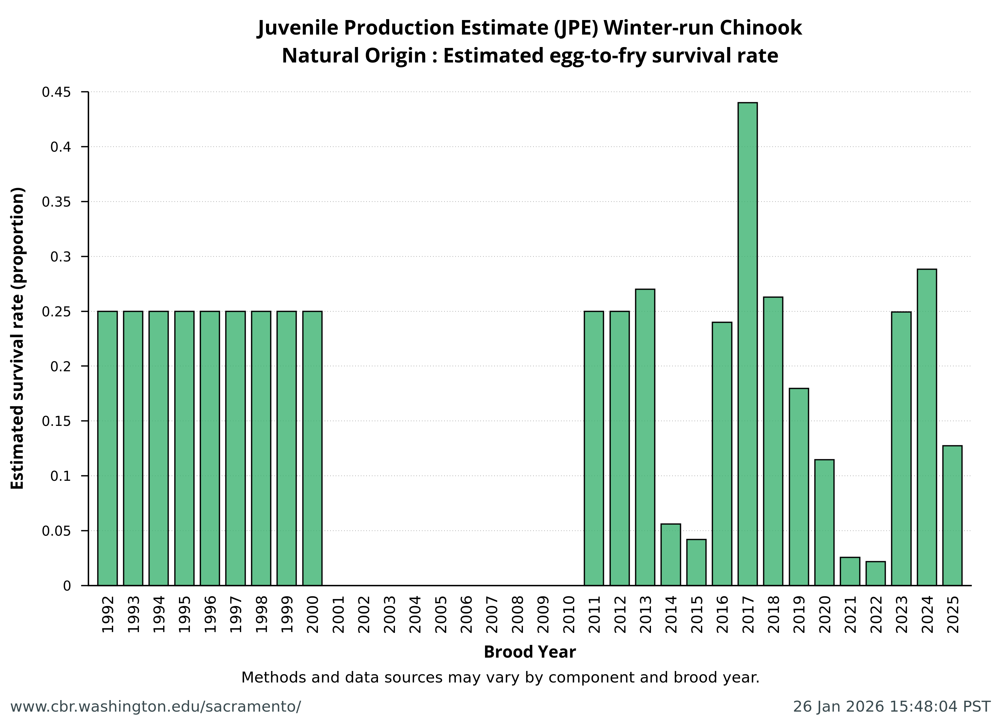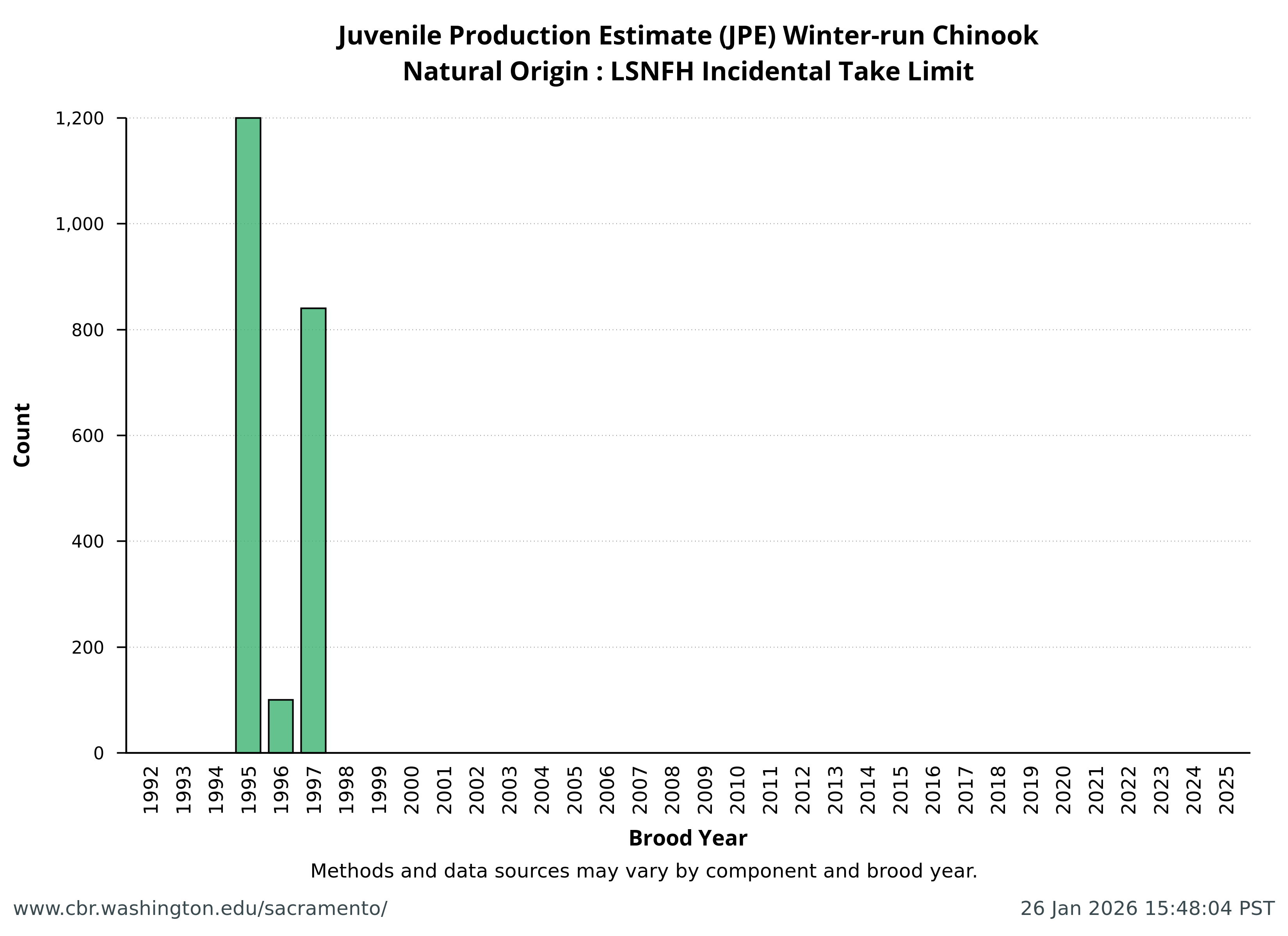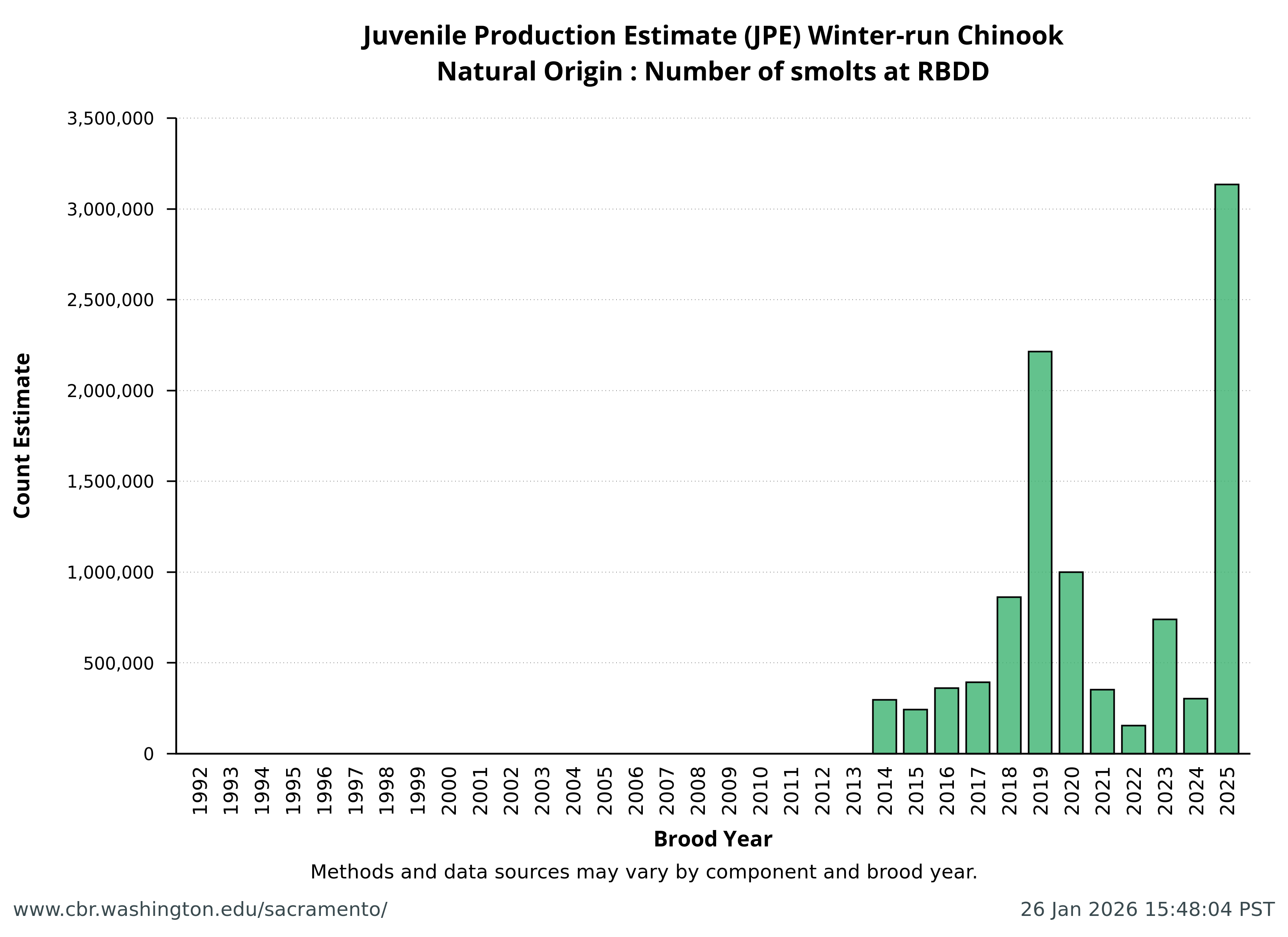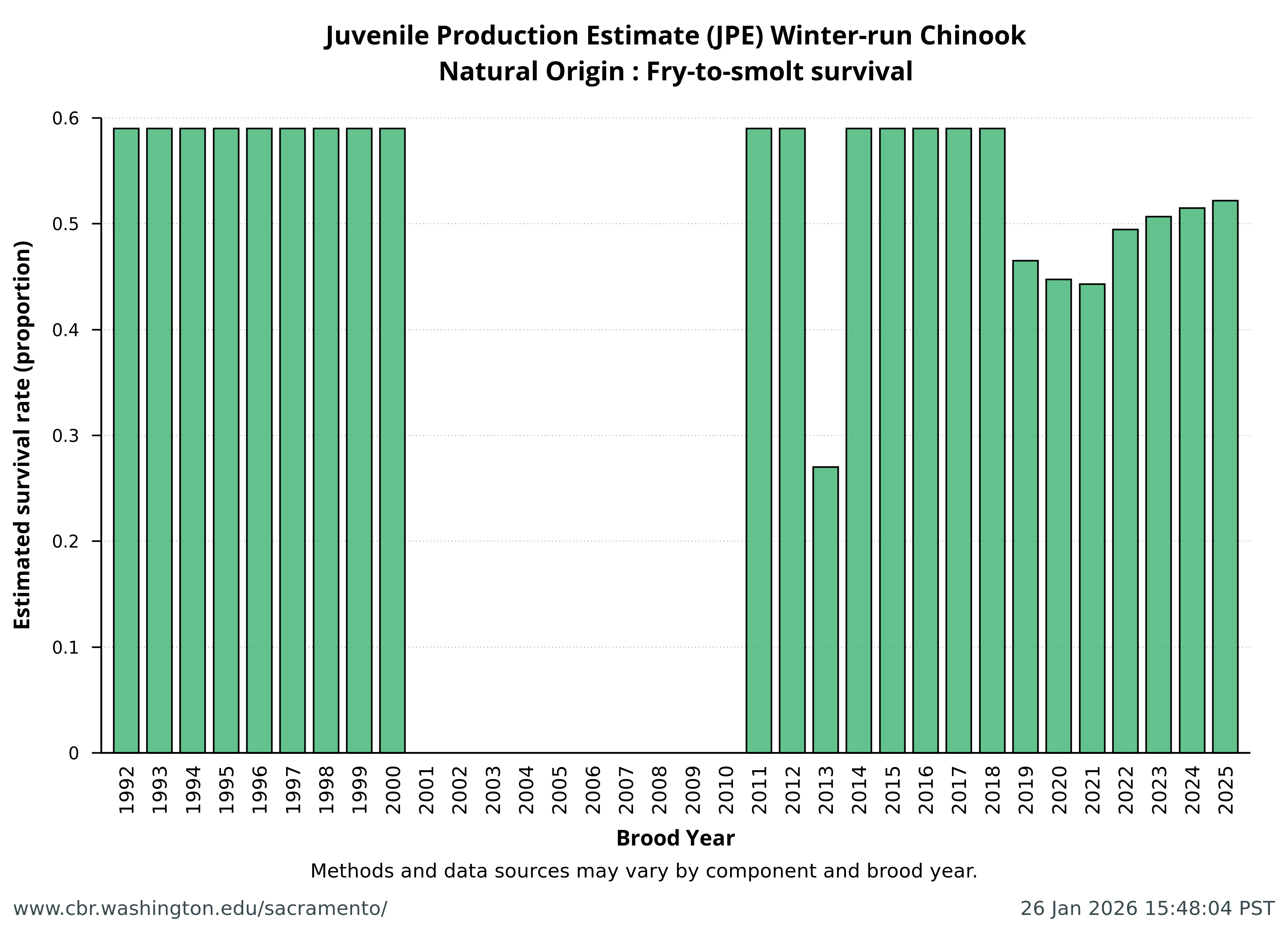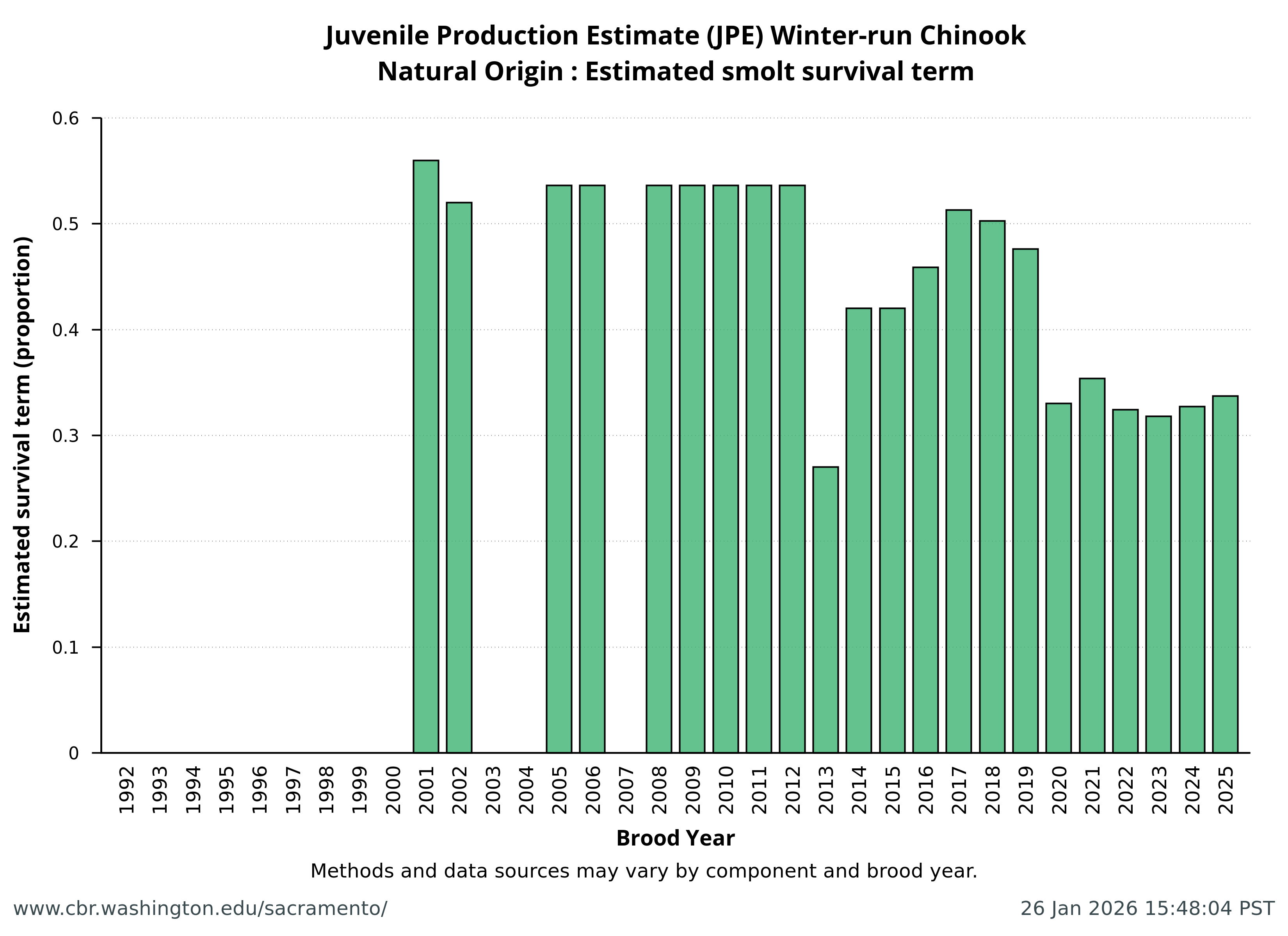 Data extracted by SacPAS from "Juvenile Production Estimates (JPE) for Sacramento River Winter-run Chinook Salmon by Brood Year" letters from National Marine Fisheries Service, National Oceanic and Atmospheric Administration, U.S. Department of Commerce to the Bureau of Reclamation, U.S. Department of the Interior (hereafter termed "JPE letter"), available from California Central Valley Water Operations: Biological Opinion Actions, NOAA Fisheries. Juvenile Production Estimates (JPE) Methods through the years.