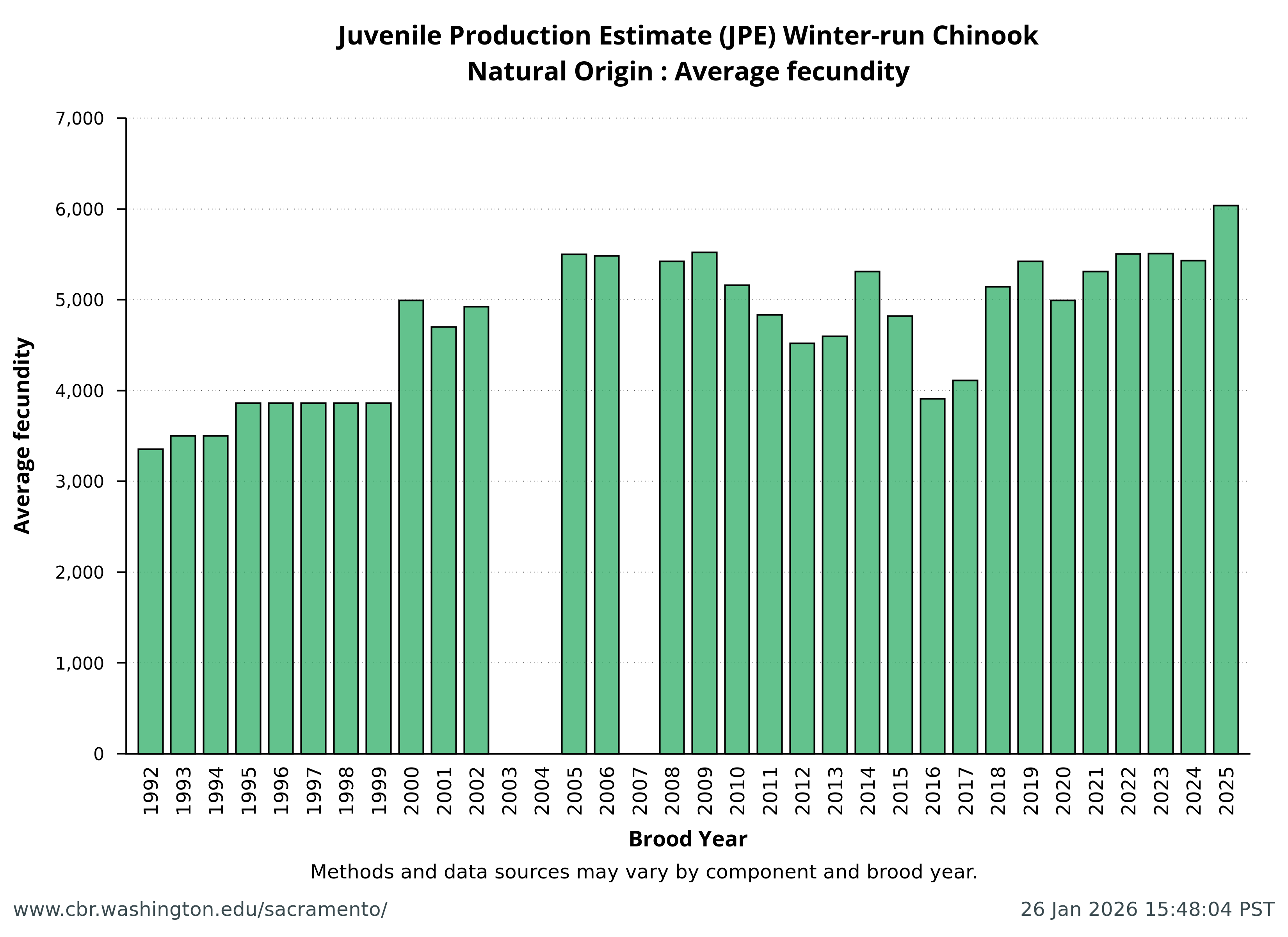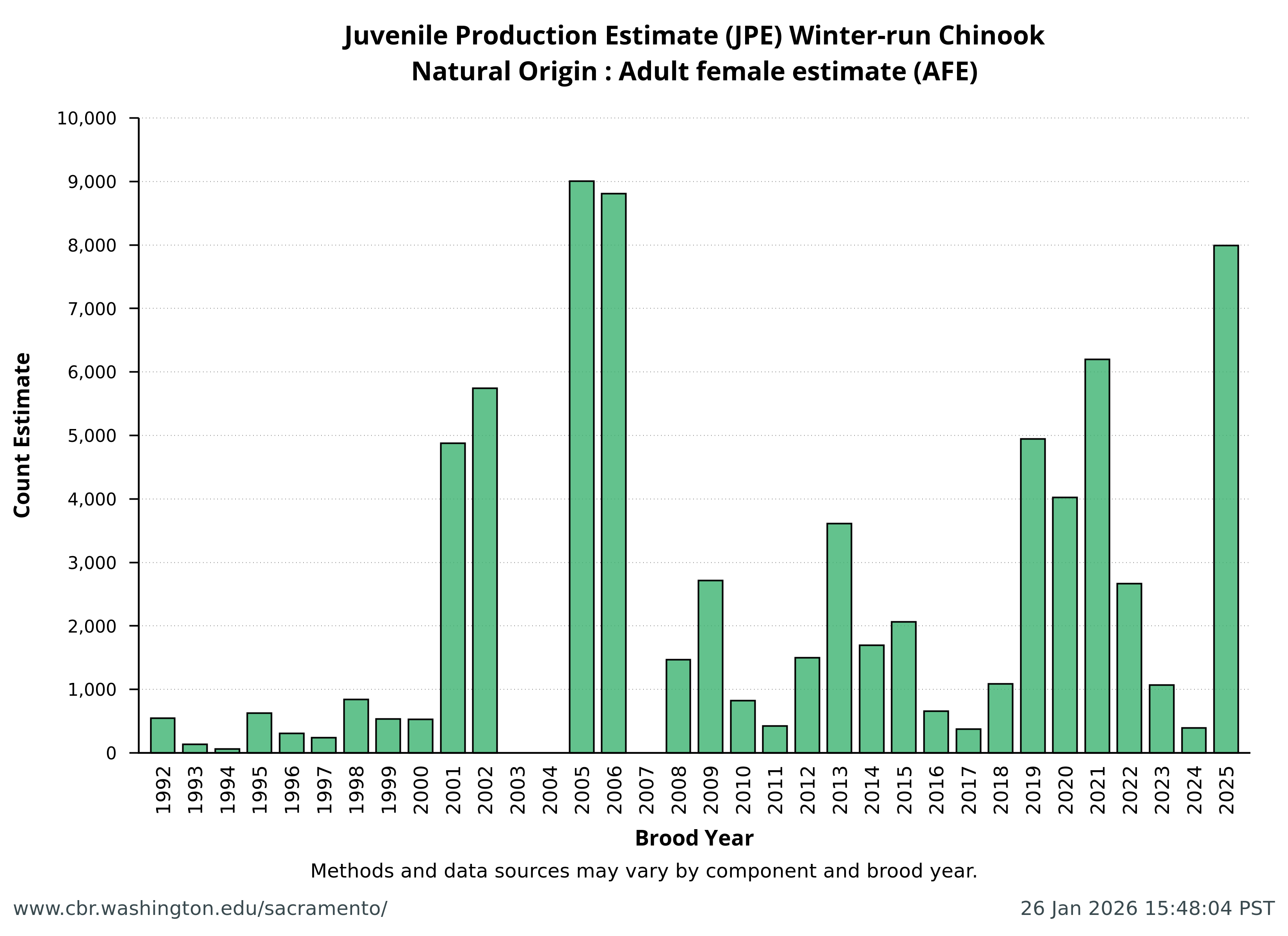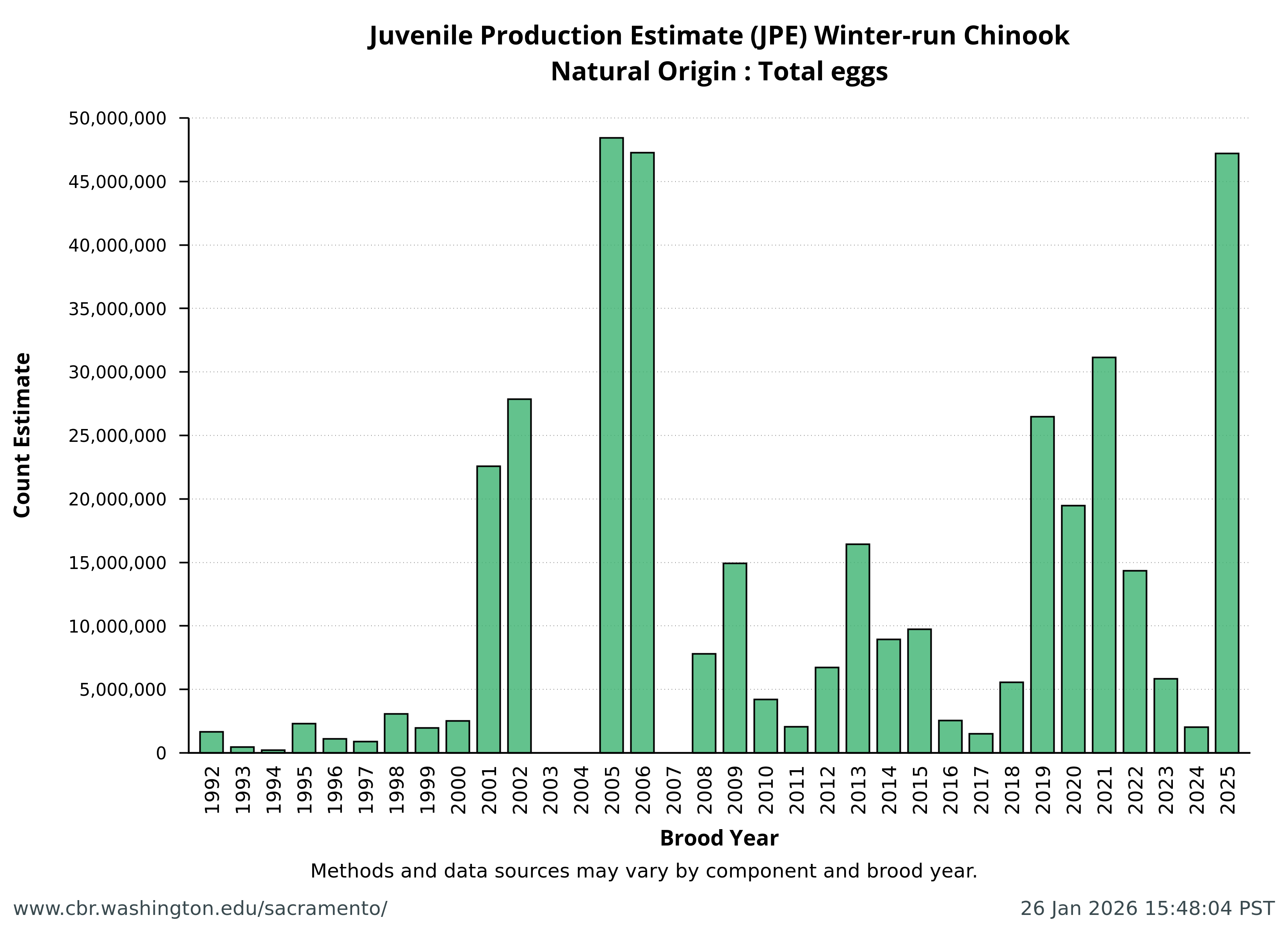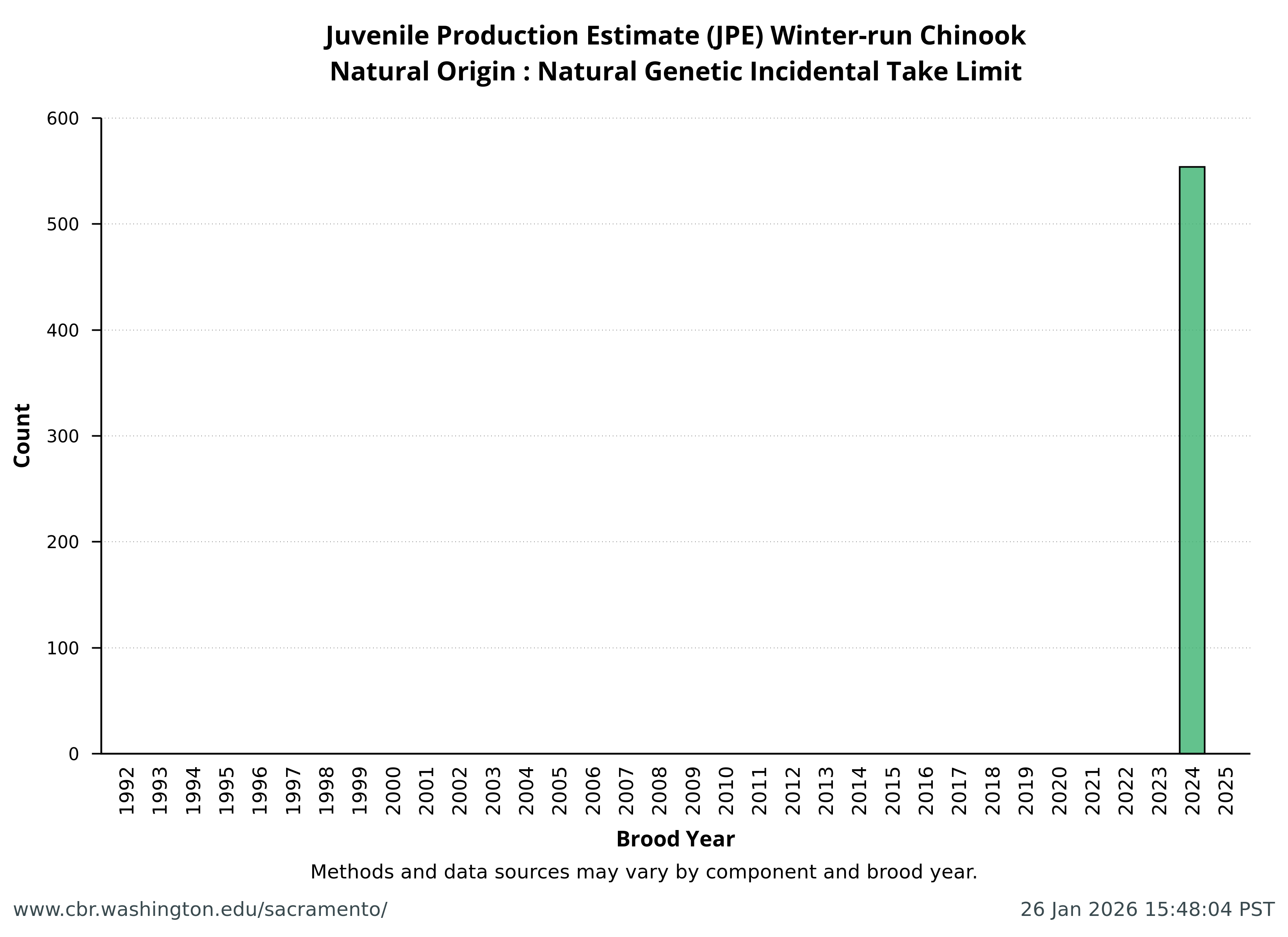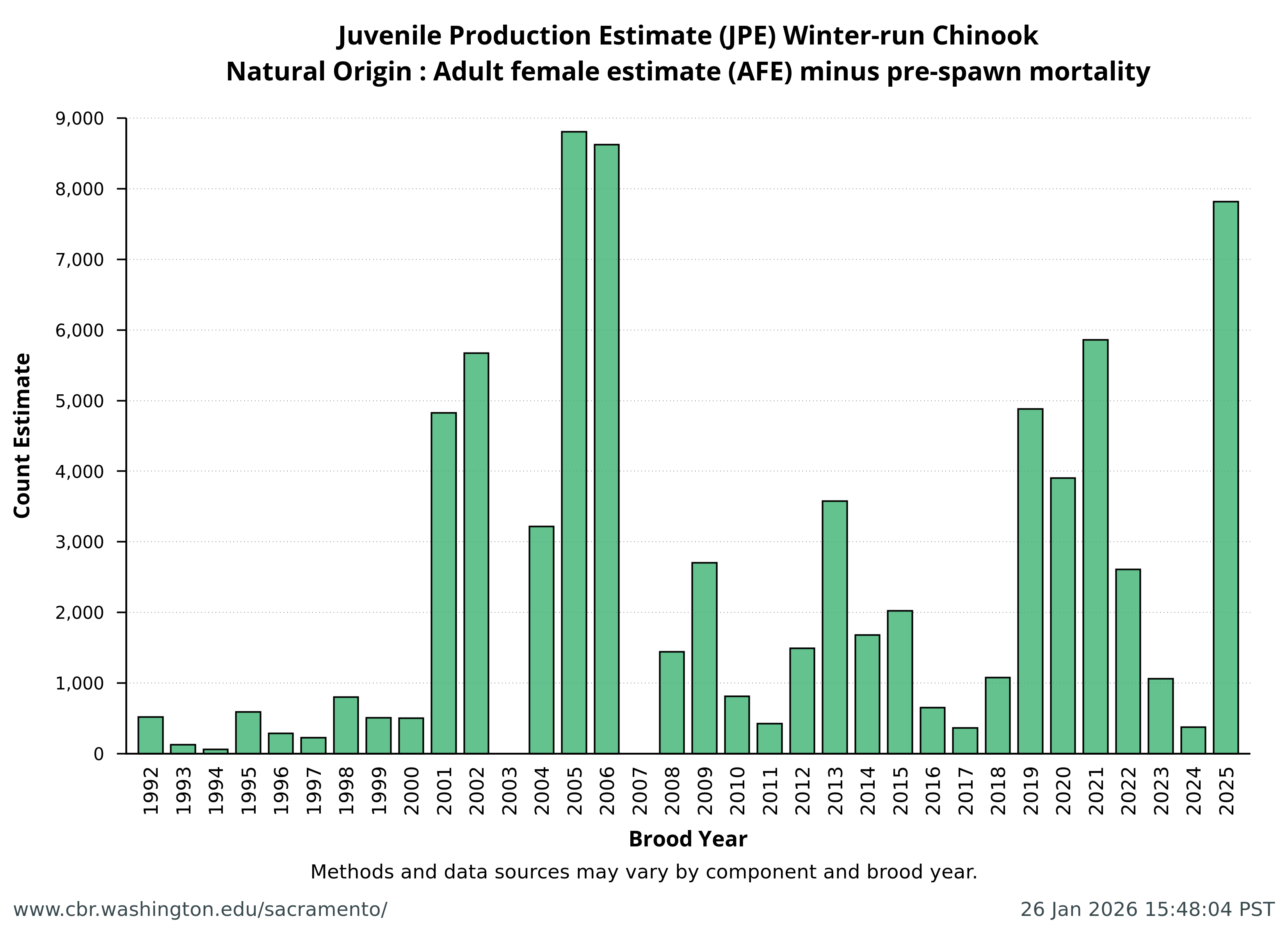 Data extracted by SacPAS from "Juvenile Production Estimates (JPE) for Sacramento River Winter-run Chinook Salmon by Brood Year" letters from National Marine Fisheries Service, National Oceanic and Atmospheric Administration, U.S. Department of Commerce to the Bureau of Reclamation, U.S. Department of the Interior (hereafter termed "JPE letter"), available from California Central Valley Water Operations: Biological Opinion Actions, NOAA Fisheries. Juvenile Production Estimates (JPE) Methods through the years.