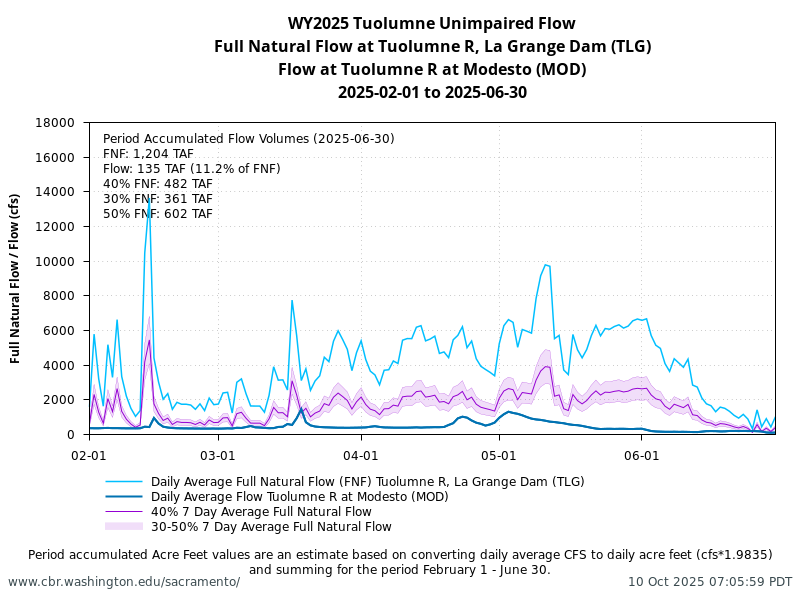 Unimpaired flow is monitored February through June at specific locations in the Stanislaus, Tuolumne, and Merced rivers.