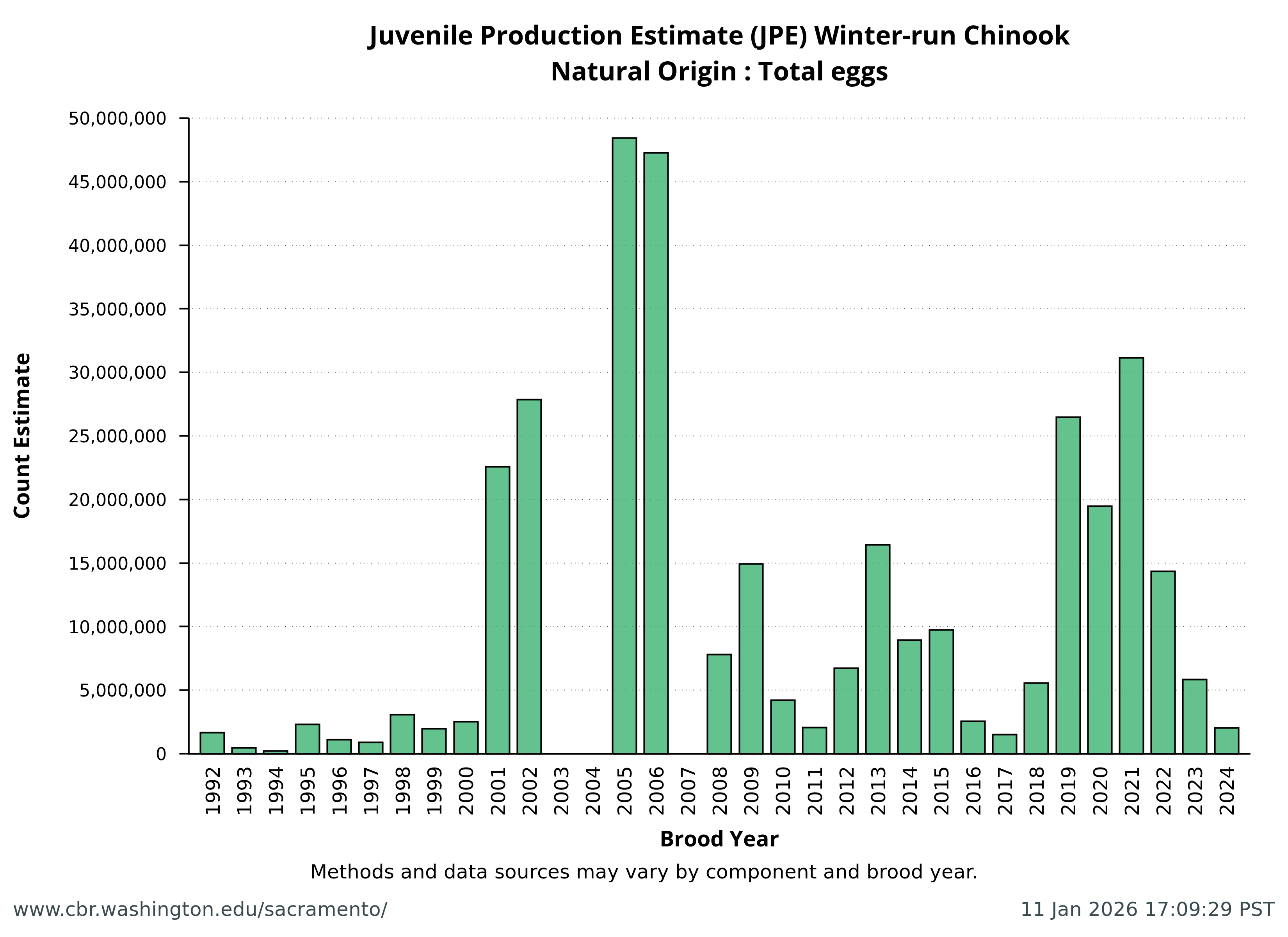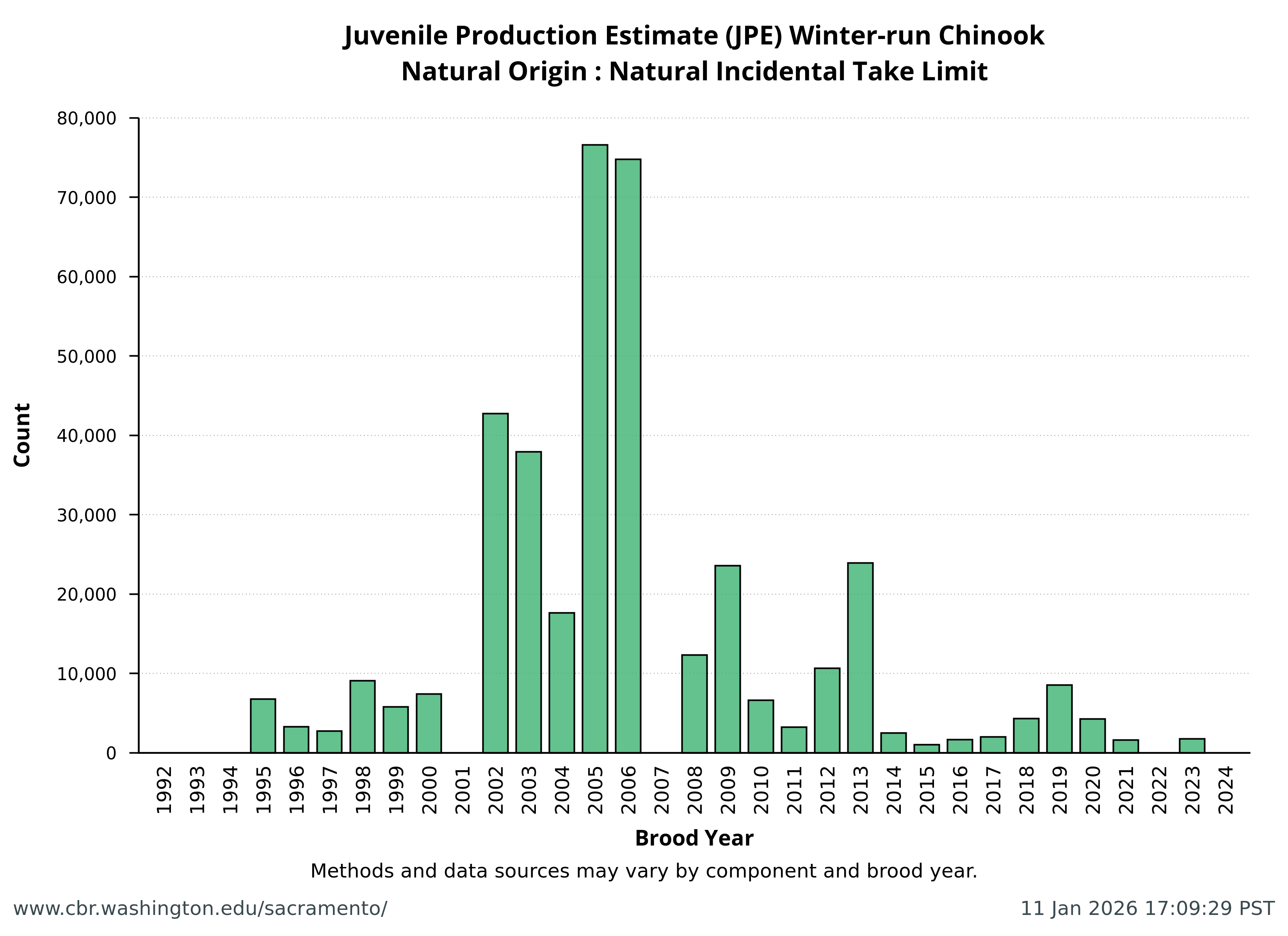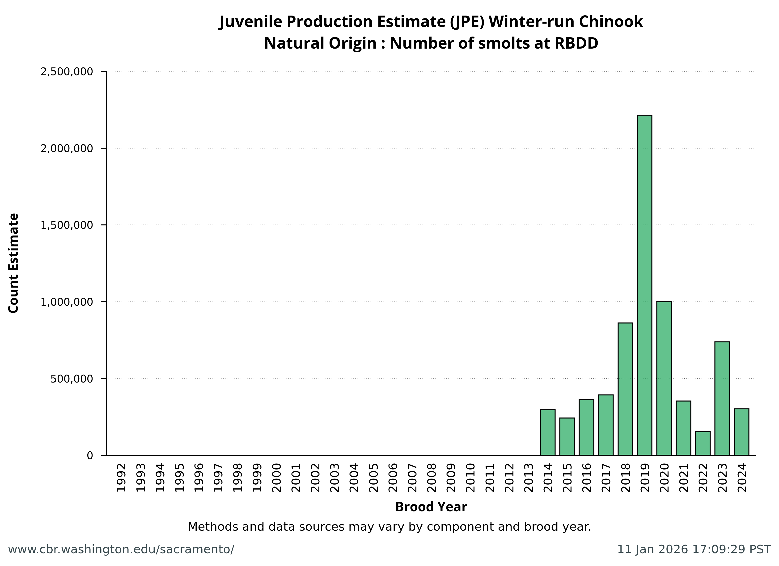 Data extracted by SacPAS from "Juvenile Production Estimates (JPE) for Sacramento River Winter-run Chinook Salmon by Brood Year" letters from National Marine Fisheries Service, National Oceanic and Atmospheric Administration, U.S. Department of Commerce to the Bureau of Reclamation, U.S. Department of the Interior (hereafter termed "JPE letter"), available from California Central Valley Water Operations: Biological Opinion Actions, NOAA Fisheries. Juvenile Production Estimates (JPE) Methods through the years.