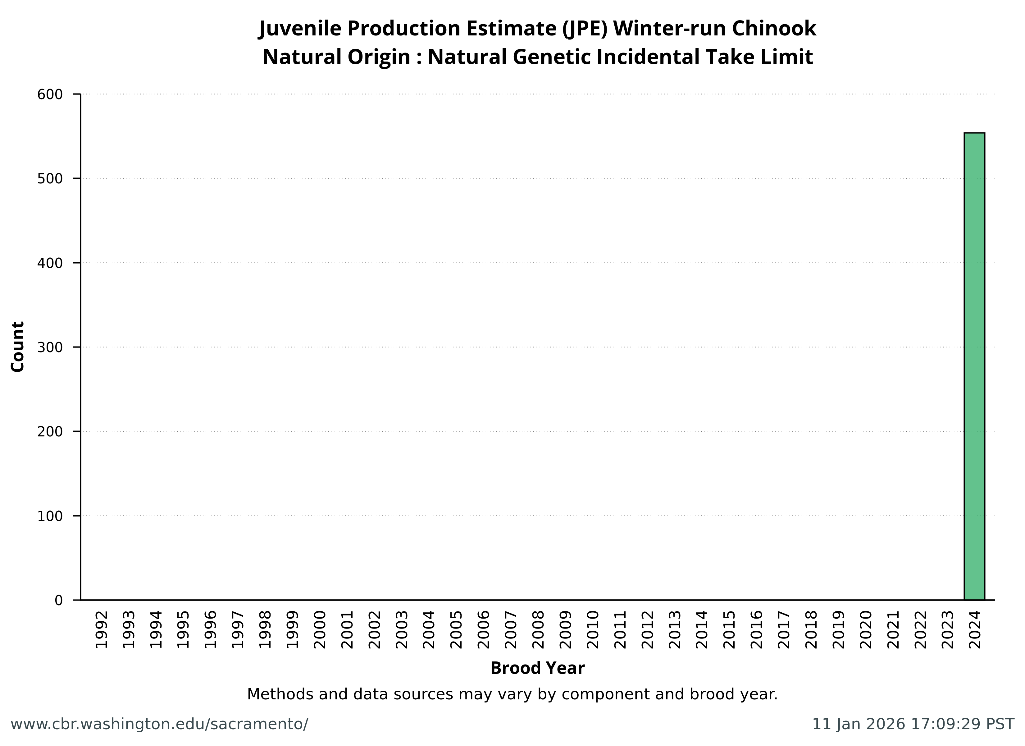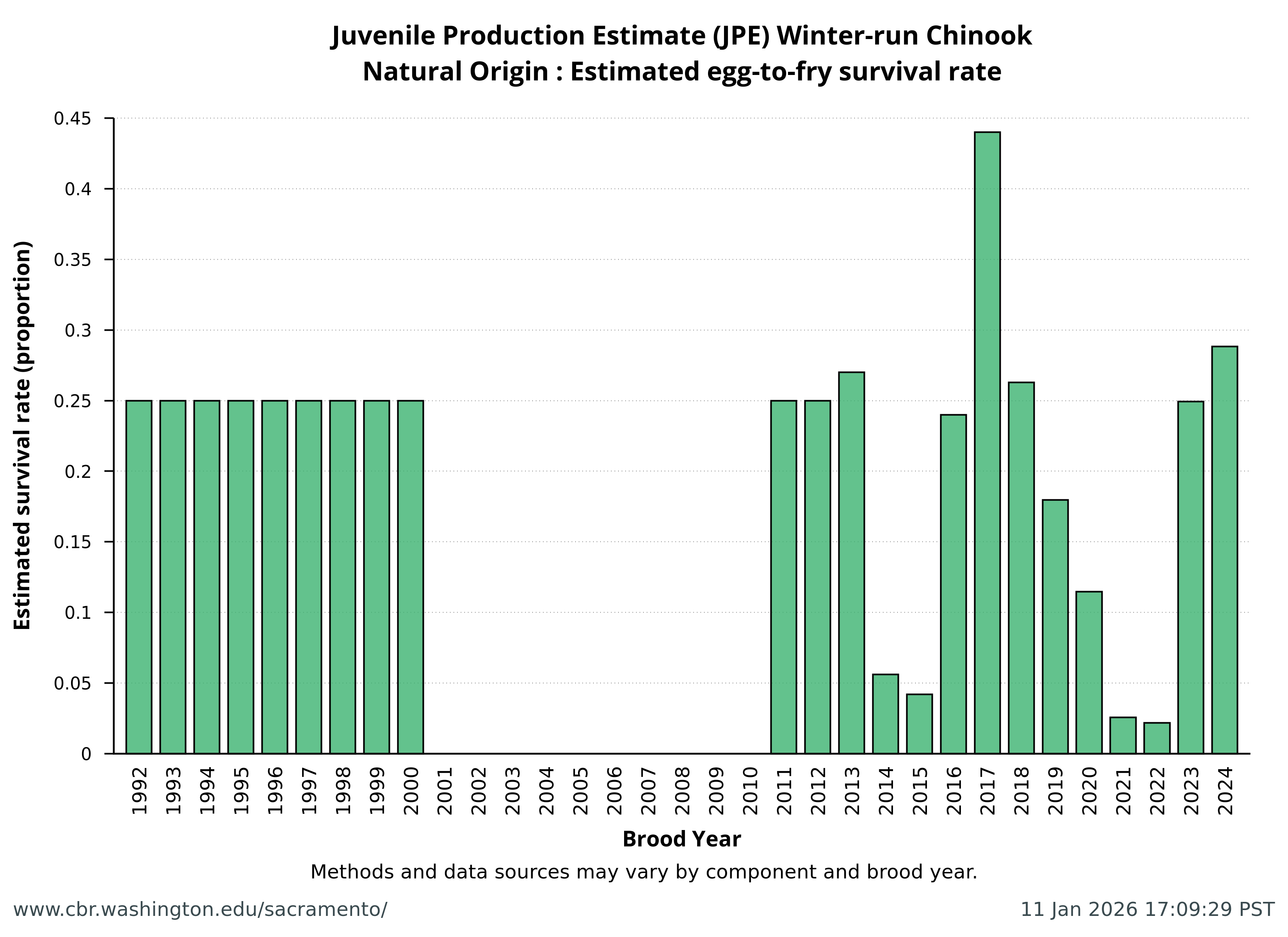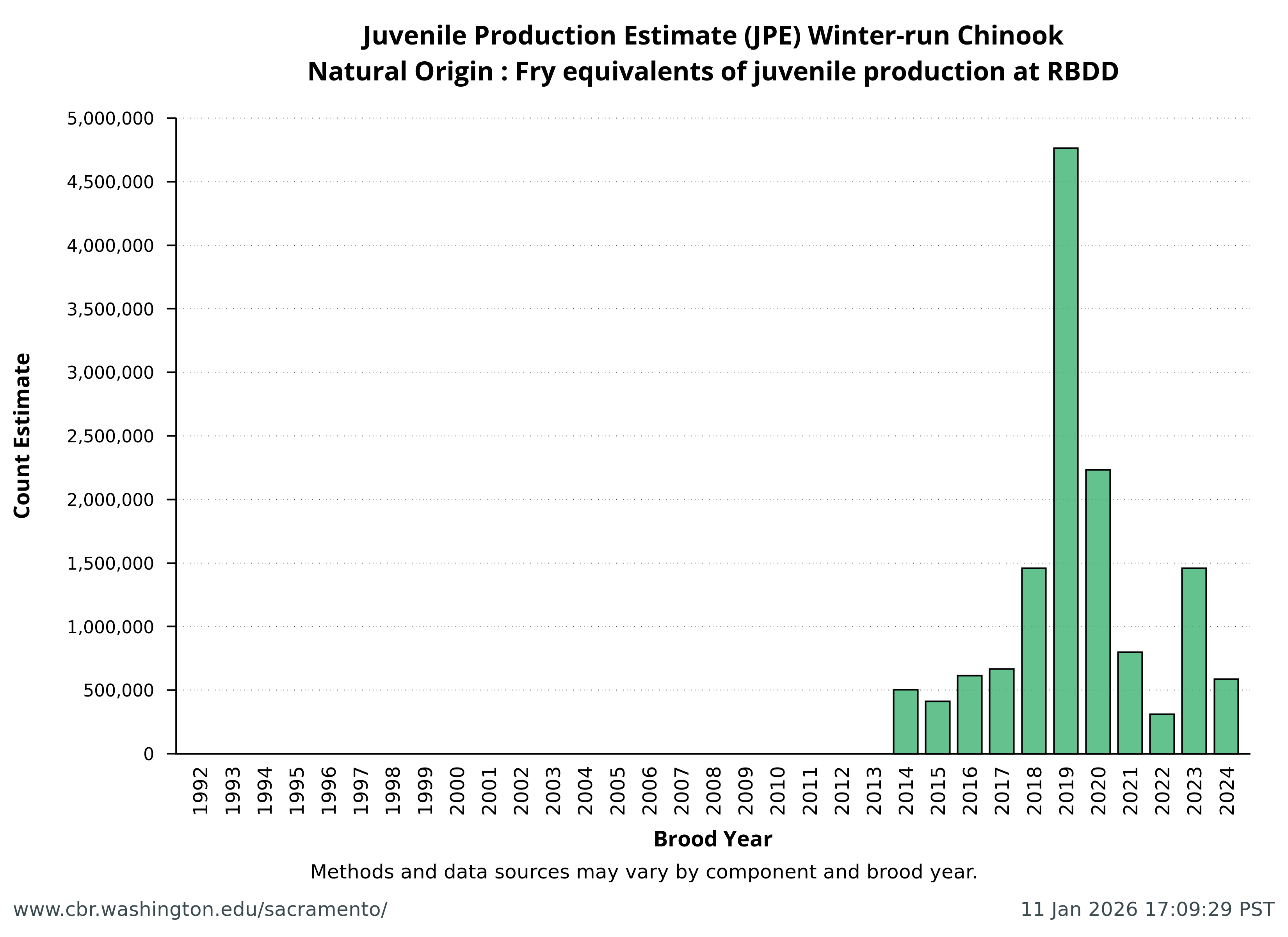 Data extracted by SacPAS from "Juvenile Production Estimates (JPE) for Sacramento River Winter-run Chinook Salmon by Brood Year" letters from National Marine Fisheries Service, National Oceanic and Atmospheric Administration, U.S. Department of Commerce to the Bureau of Reclamation, U.S. Department of the Interior (hereafter termed "JPE letter"), available from California Central Valley Water Operations: Biological Opinion Actions, NOAA Fisheries. Juvenile Production Estimates (JPE) Methods through the years.