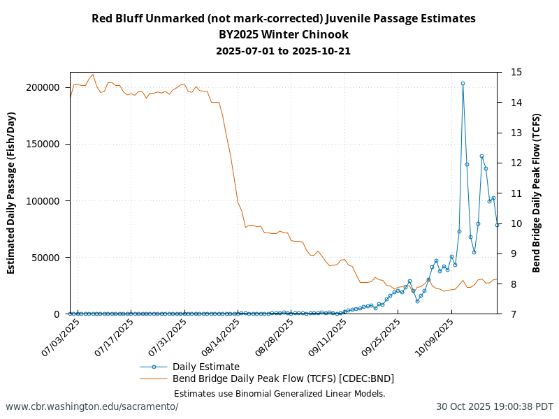 The fully revised daily and weekly passage estimates and BY2025 estimates are available from Red Bluff specific queries: