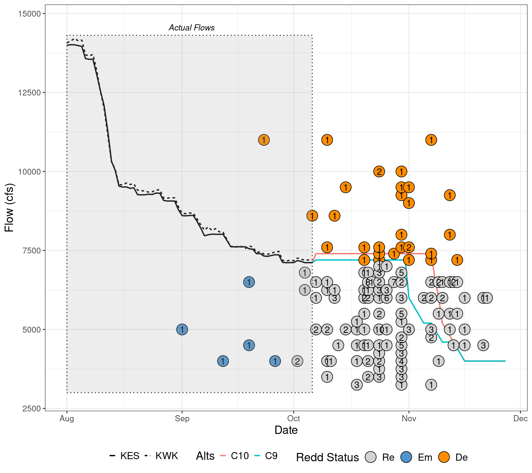 There is no real time data on fall-run redd counts. Estimates are predicted based on estimated dewatering percentages from USFWS (2006) and spring-run and fall-run spawn timing based on fresh female carcasses encountered from 2014 through 2023. Emergence timing were predicted from water temperatures below Keswick individually for each year and dewatering was estimated for each scenario for each year to capture annual variance in spawn timing. Fall-run dewatering estimates range from 6.9 to 18.8% (see detailed data in table below). Note that fall-run dewatering estimates are likely overestimated using the dewatering percentages from USFWS (2006), and likely do not reflect actual dewatering percentages and should only be used for comparative purposes between scenarios. A comparative analysis between field and modeled dewatering percentages by Gosselin and Beer (2024) can be found here.