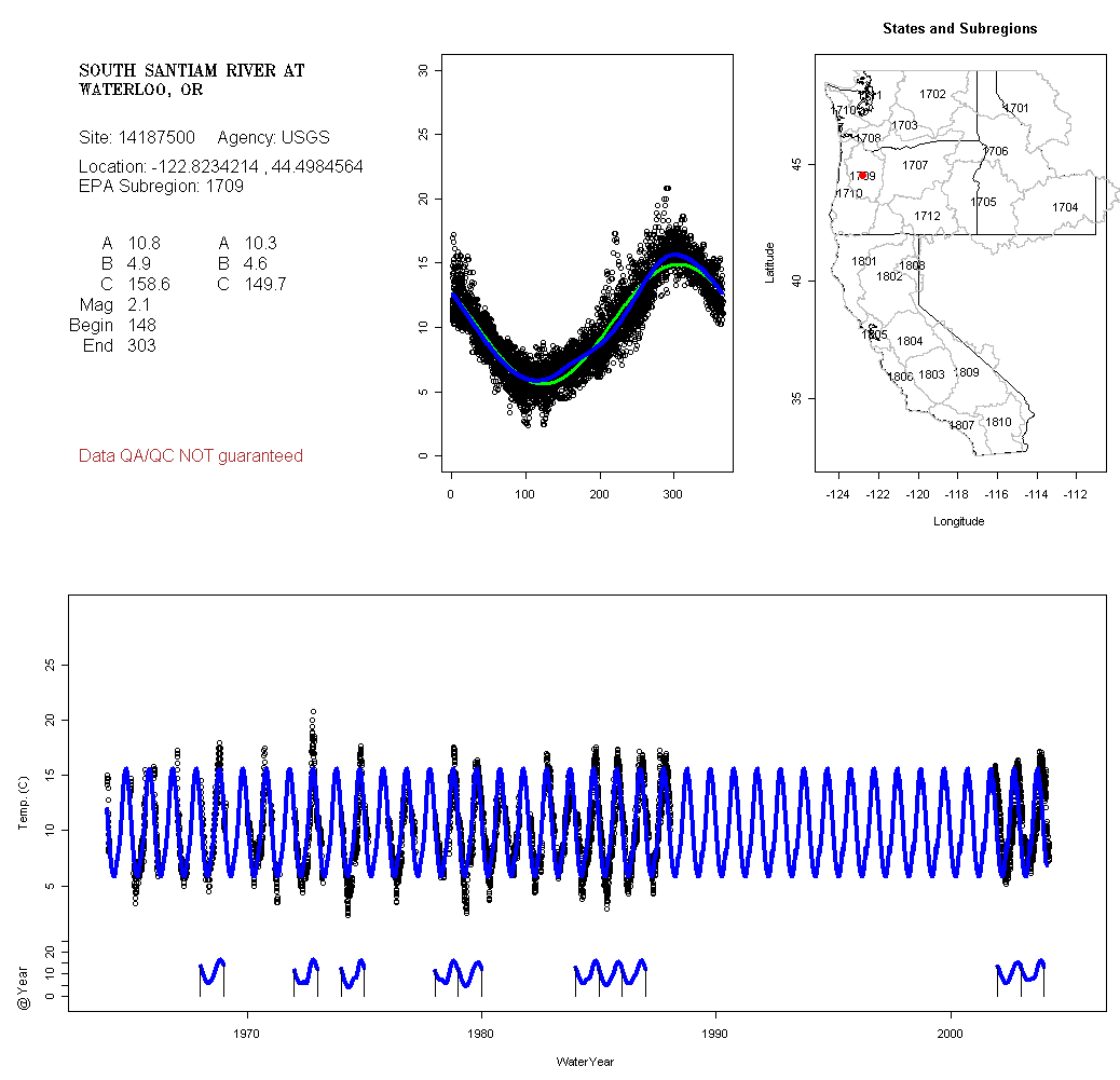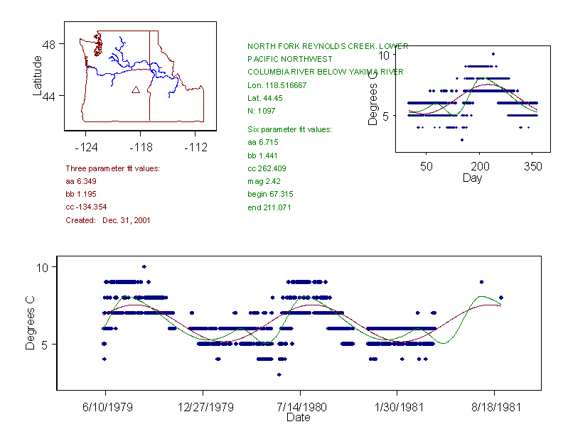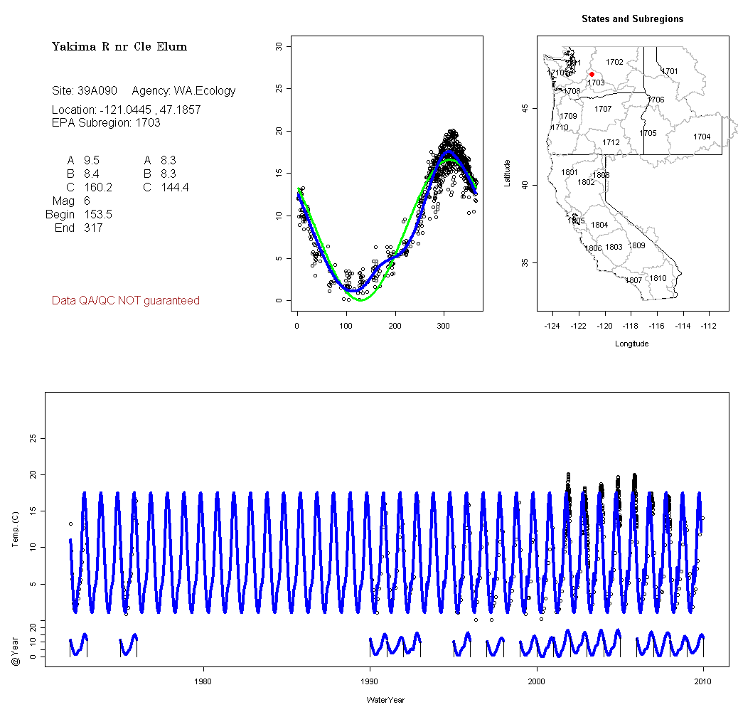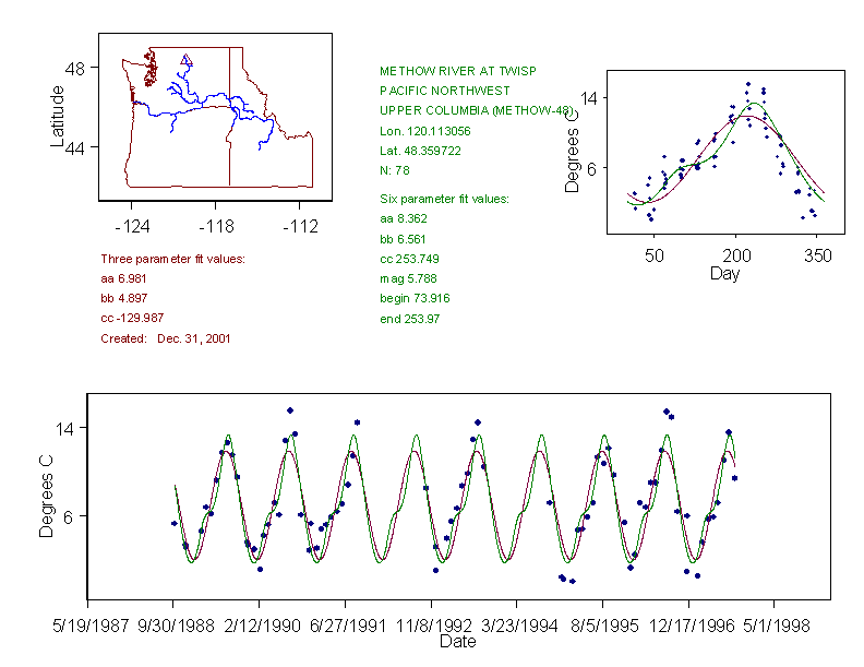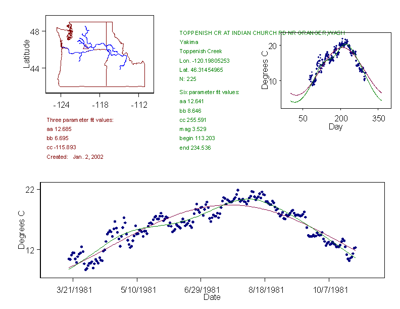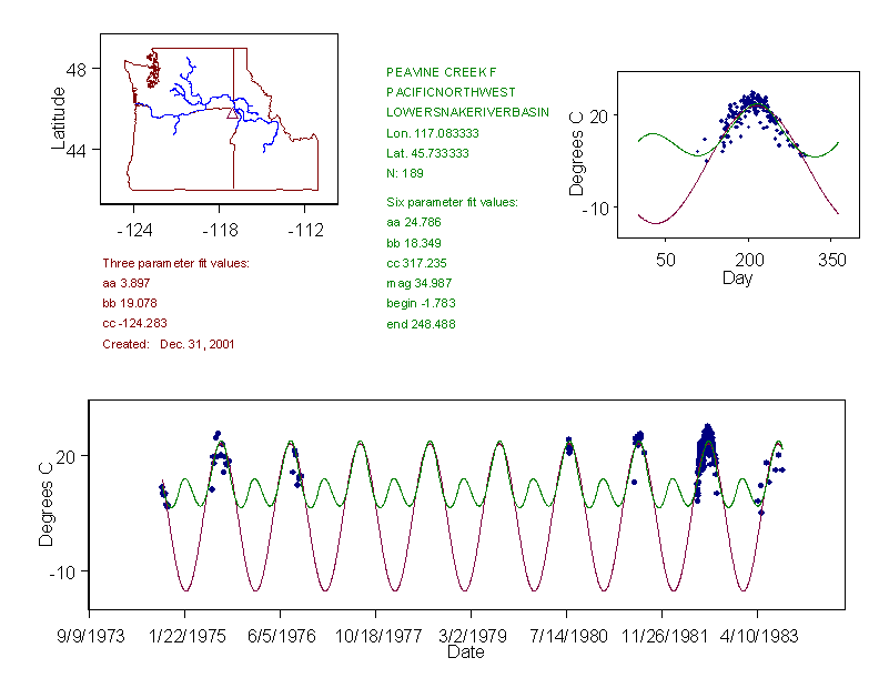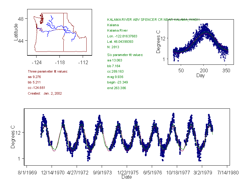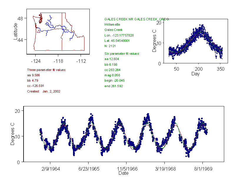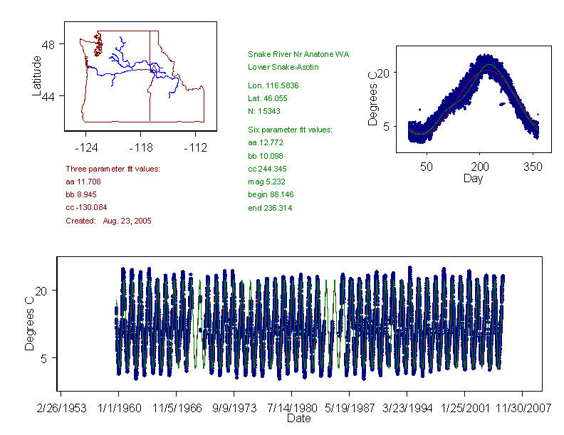 Historical data depicted in these plots are from various sources: California Data Exchange Center, USGS National Water Information System, WA Department of Ecology, EPA STORET, and StreamNet. Attempts were made to fit two sinusoidal curves through the data. One with 6 parameters and the other with 3 parameters. The non-linear solver function in the software package R (2.11.1 and later) was used for this purpose. The intention of the 6 parameter model is to allow for spring-time snowmelt effects on the temperature profile to be recognized where appropriate. However, not all of the streams have snowmelt contributions and many have significant anthropogenic influences. Click here for details on the 6 parameter model. It has been used to model temperatures in select streams.
