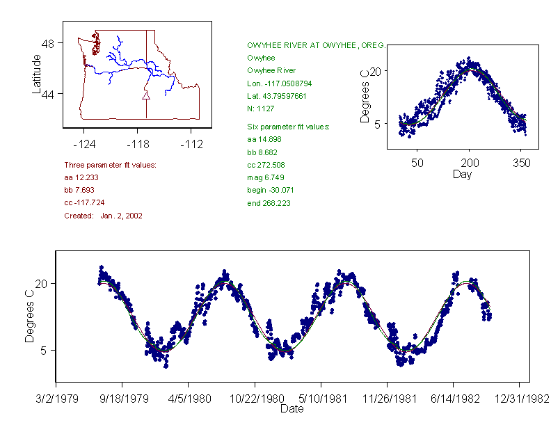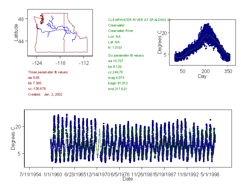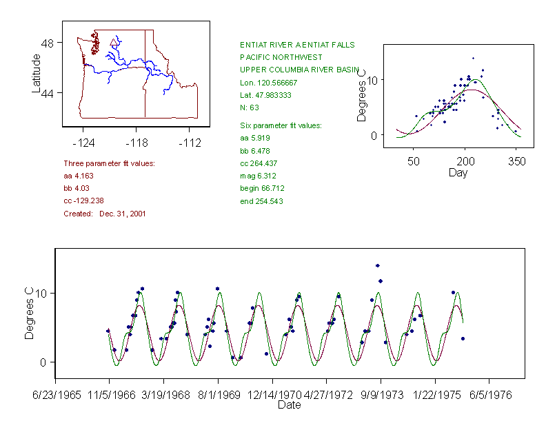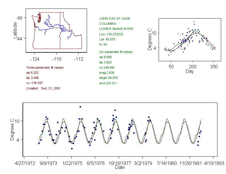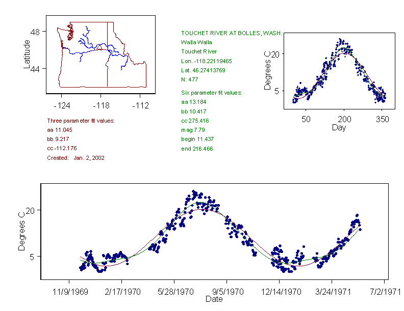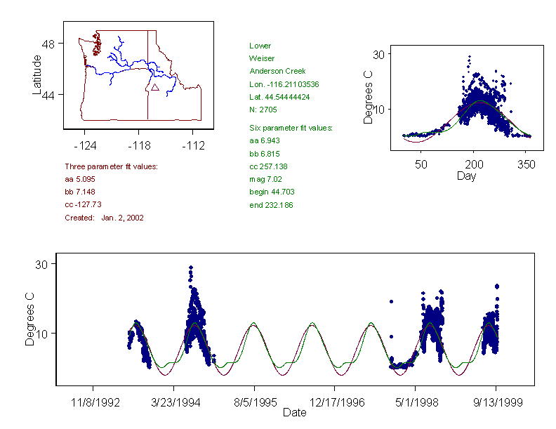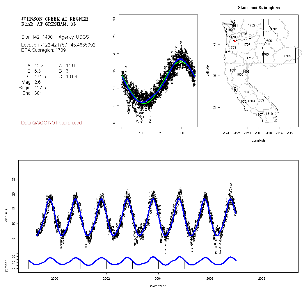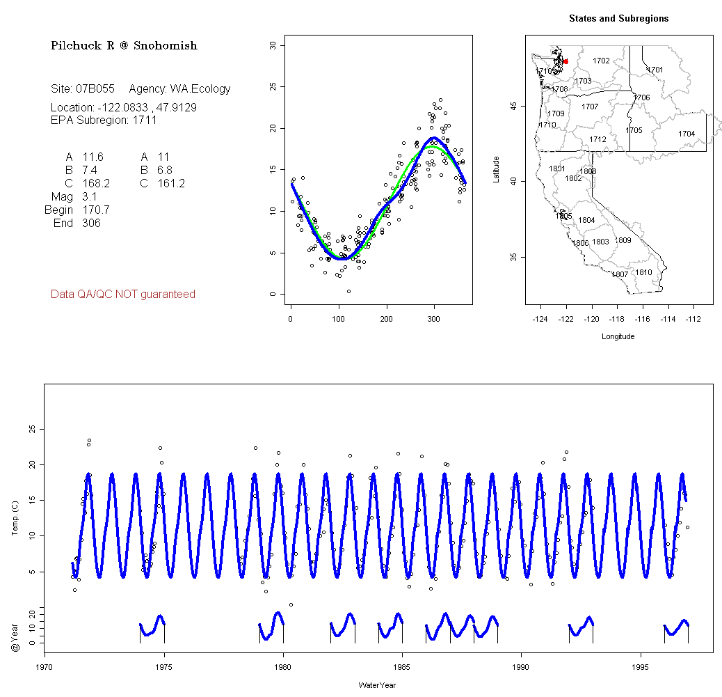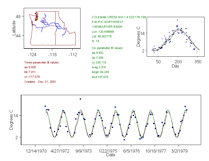 Historical data depicted in these plots are from various sources: California Data Exchange Center, USGS National Water Information System, WA Department of Ecology, EPA STORET, and StreamNet. Attempts were made to fit two sinusoidal curves through the data. One with 6 parameters and the other with 3 parameters. The non-linear solver function in the software package R (2.11.1 and later) was used for this purpose. The intention of the 6 parameter model is to allow for spring-time snowmelt effects on the temperature profile to be recognized where appropriate. However, not all of the streams have snowmelt contributions and many have significant anthropogenic influences. Click here for details on the 6 parameter model. It has been used to model temperatures in select streams.