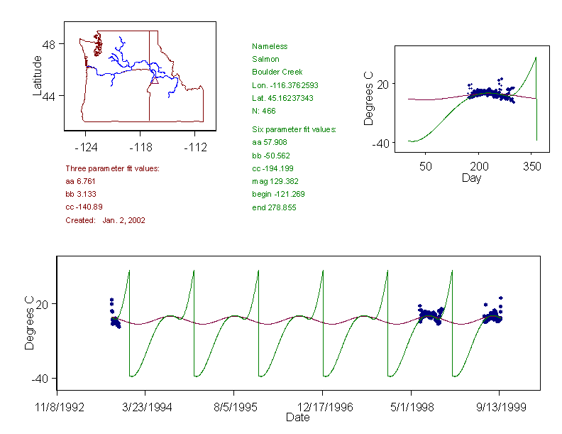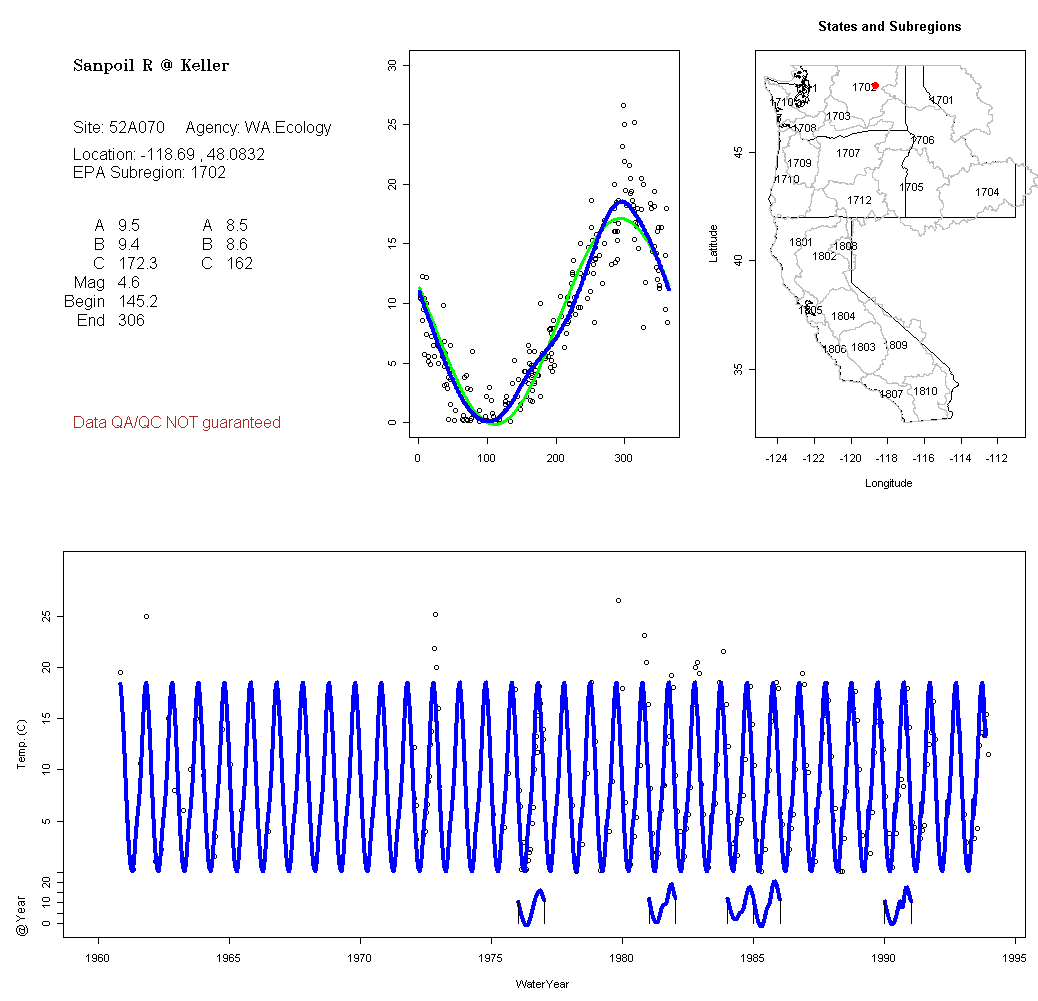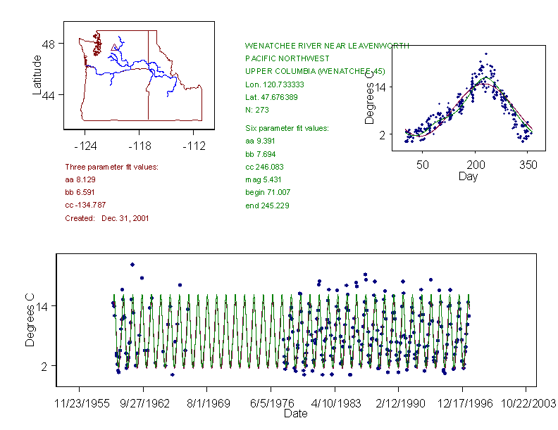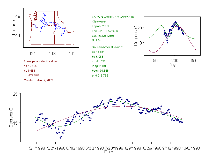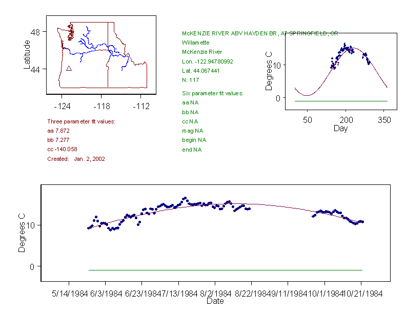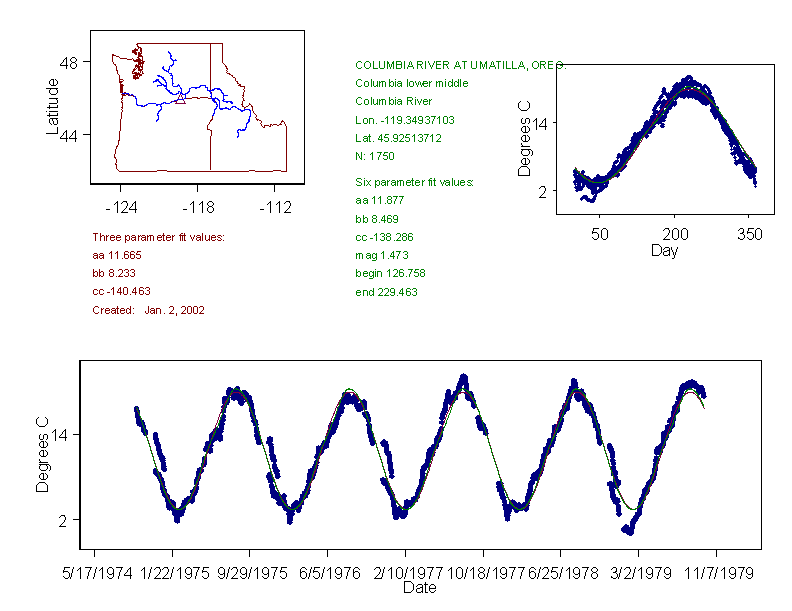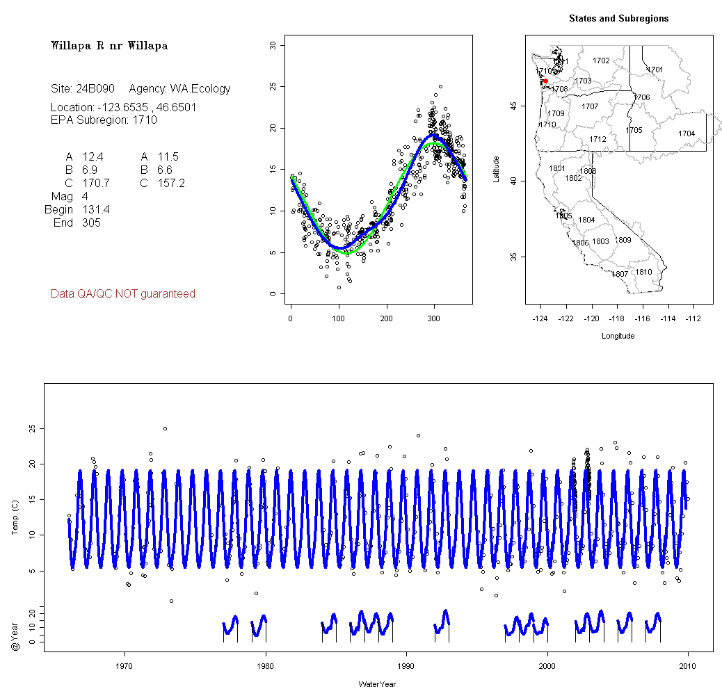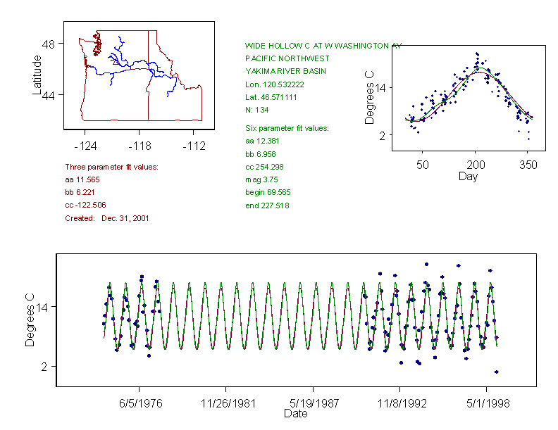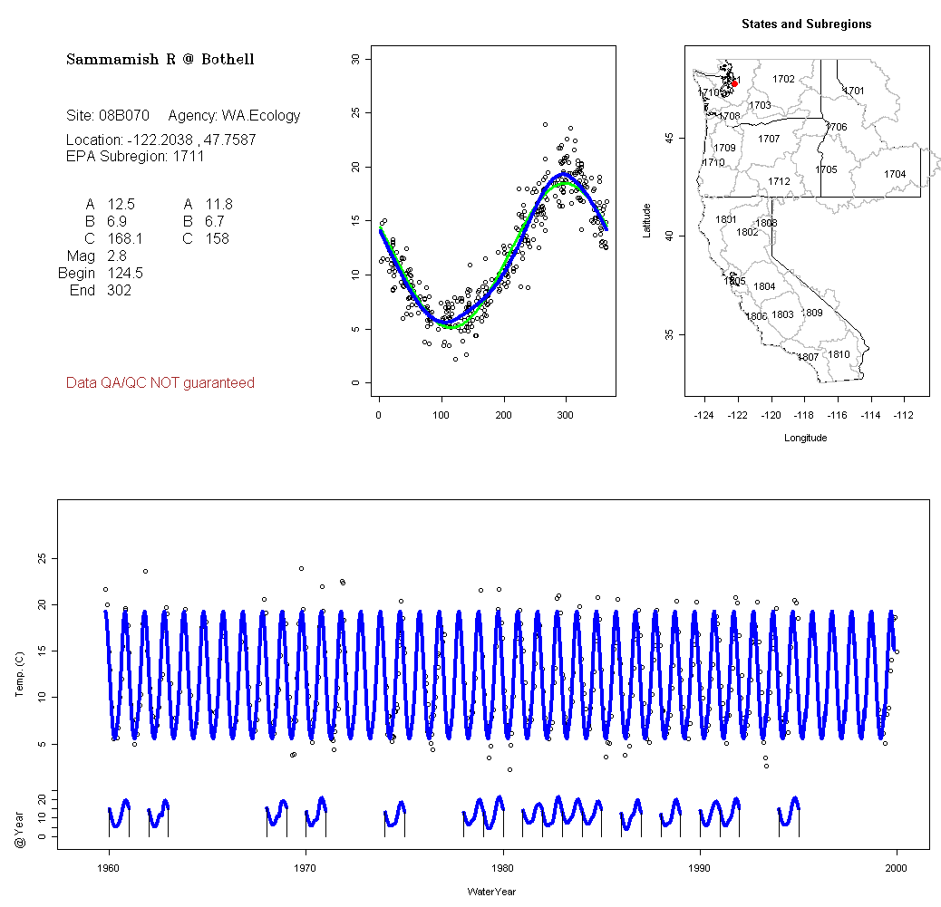 Historical data depicted in these plots are from various sources: California Data Exchange Center, USGS National Water Information System, WA Department of Ecology, EPA STORET, and StreamNet. Attempts were made to fit two sinusoidal curves through the data. One with 6 parameters and the other with 3 parameters. The non-linear solver function in the software package R (2.11.1 and later) was used for this purpose. The intention of the 6 parameter model is to allow for spring-time snowmelt effects on the temperature profile to be recognized where appropriate. However, not all of the streams have snowmelt contributions and many have significant anthropogenic influences. Click here for details on the 6 parameter model. It has been used to model temperatures in select streams.