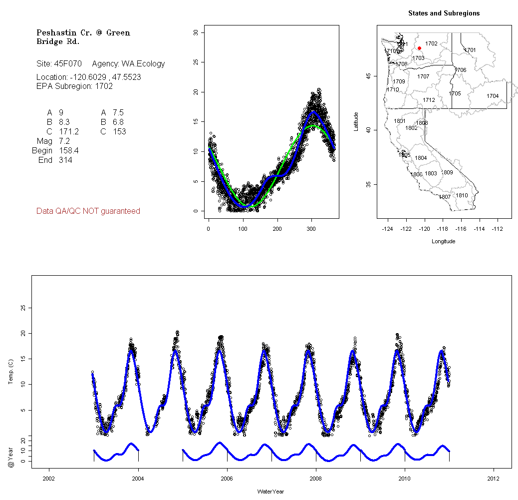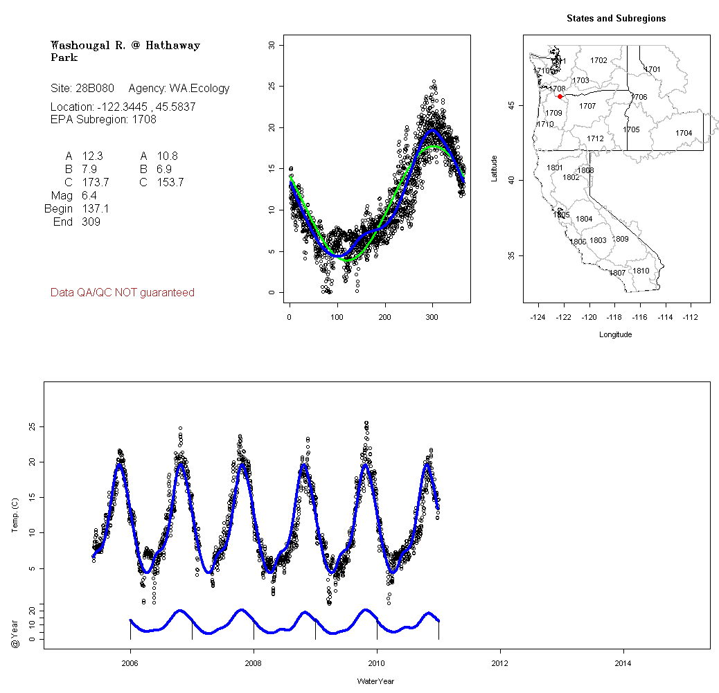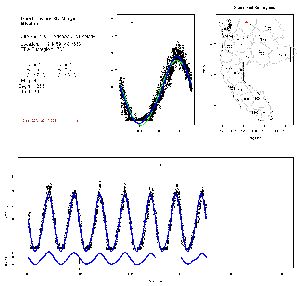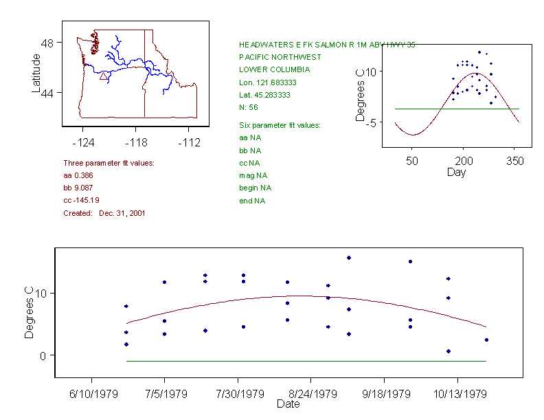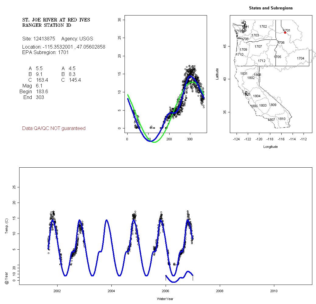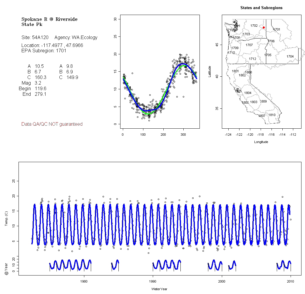 Historical data depicted in these plots are from various sources: California Data Exchange Center, USGS National Water Information System, WA Department of Ecology, EPA STORET, and StreamNet. Attempts were made to fit two sinusoidal curves through the data. One with 6 parameters and the other with 3 parameters. The non-linear solver function in the software package R (2.11.1 and later) was used for this purpose. The intention of the 6 parameter model is to allow for spring-time snowmelt effects on the temperature profile to be recognized where appropriate. However, not all of the streams have snowmelt contributions and many have significant anthropogenic influences. Click here for details on the 6 parameter model. It has been used to model temperatures in select streams.