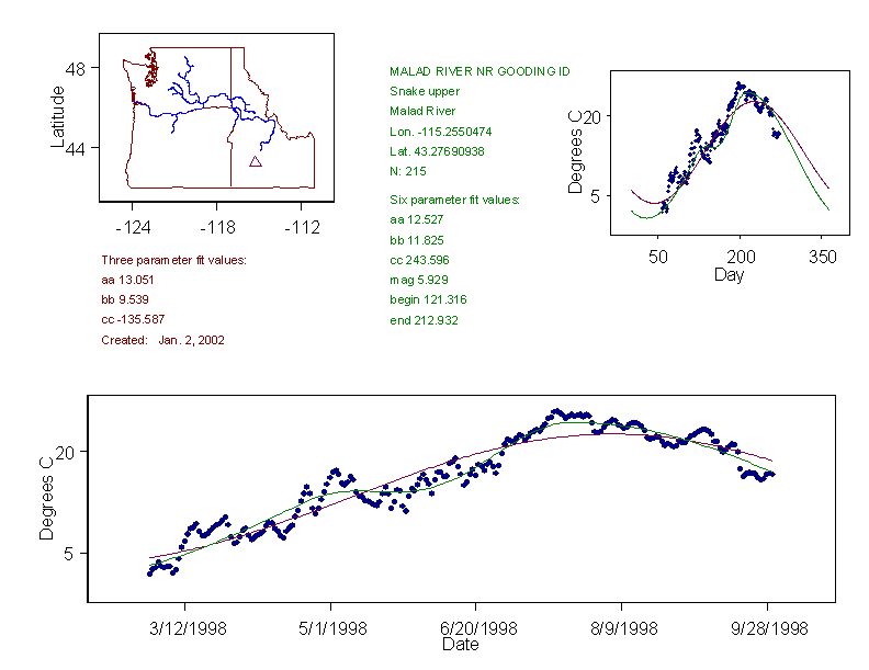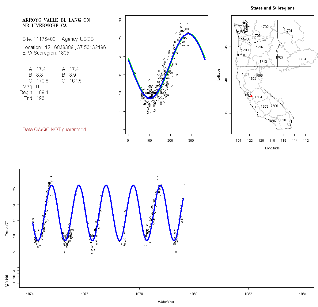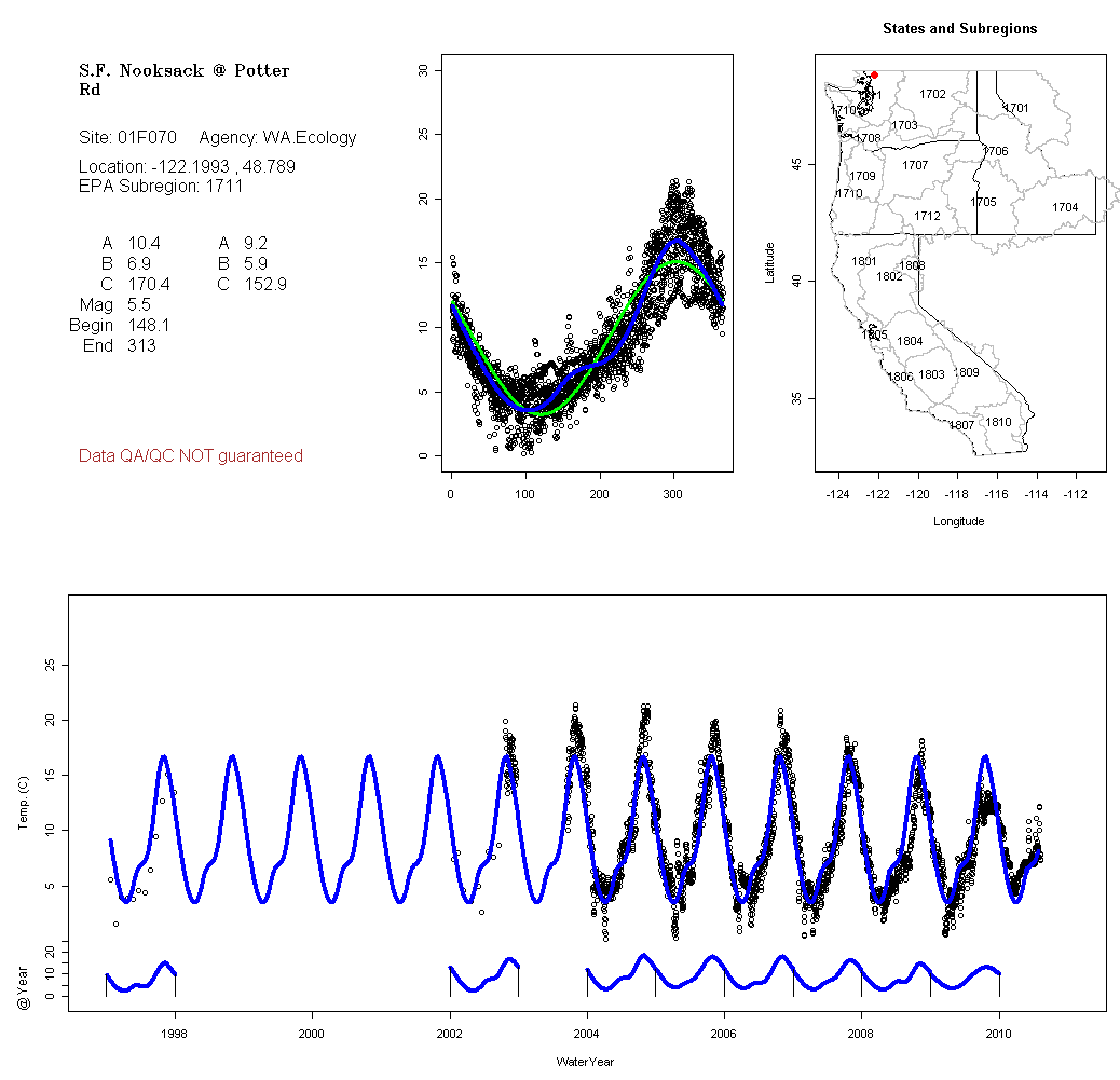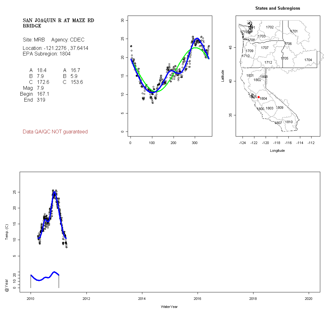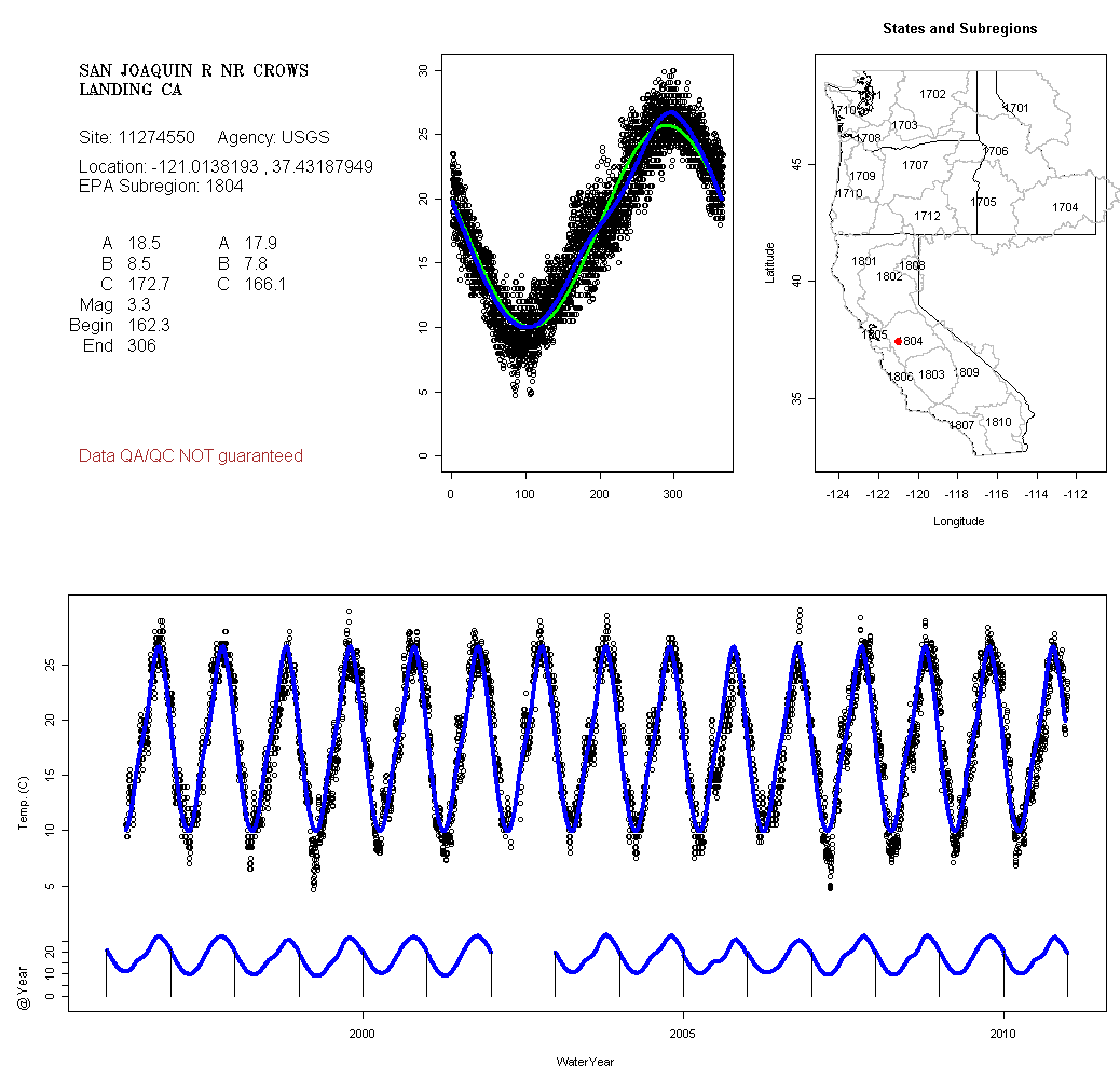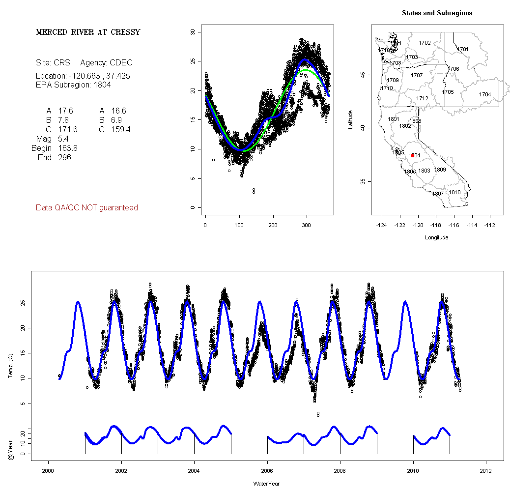 Historical data depicted in these plots are from various sources: California Data Exchange Center, USGS National Water Information System, WA Department of Ecology, EPA STORET, and StreamNet. Attempts were made to fit two sinusoidal curves through the data. One with 6 parameters and the other with 3 parameters. The non-linear solver function in the software package R (2.11.1 and later) was used for this purpose. The intention of the 6 parameter model is to allow for spring-time snowmelt effects on the temperature profile to be recognized where appropriate. However, not all of the streams have snowmelt contributions and many have significant anthropogenic influences. Click here for details on the 6 parameter model. It has been used to model temperatures in select streams.