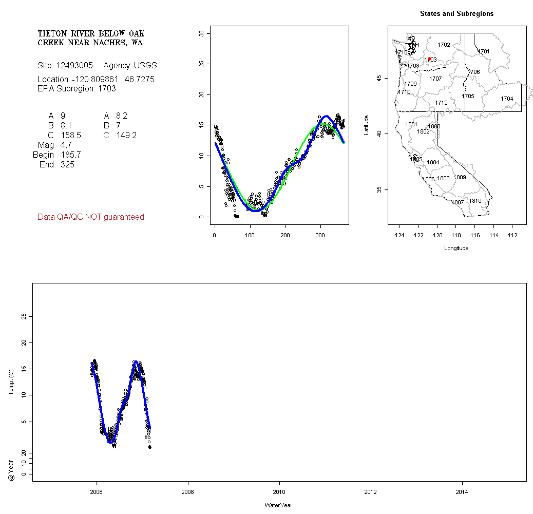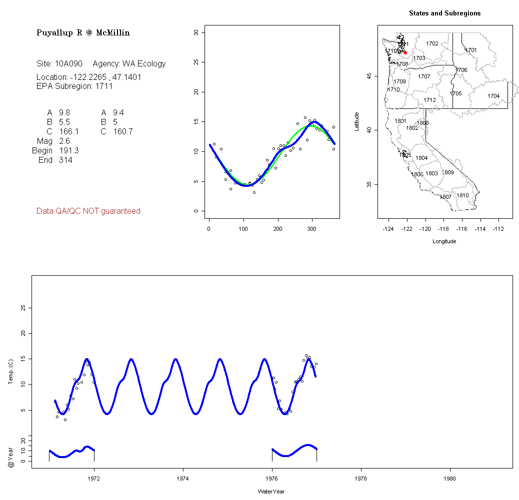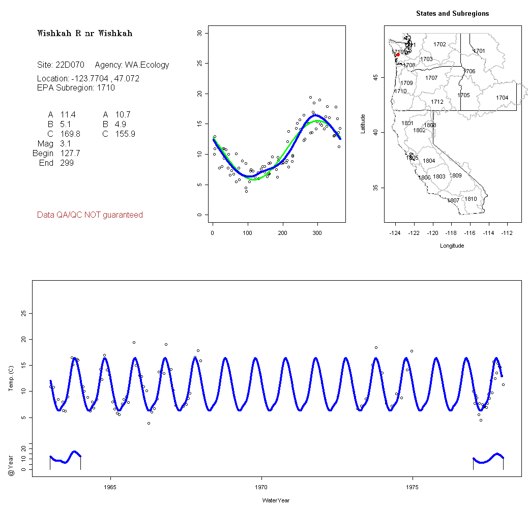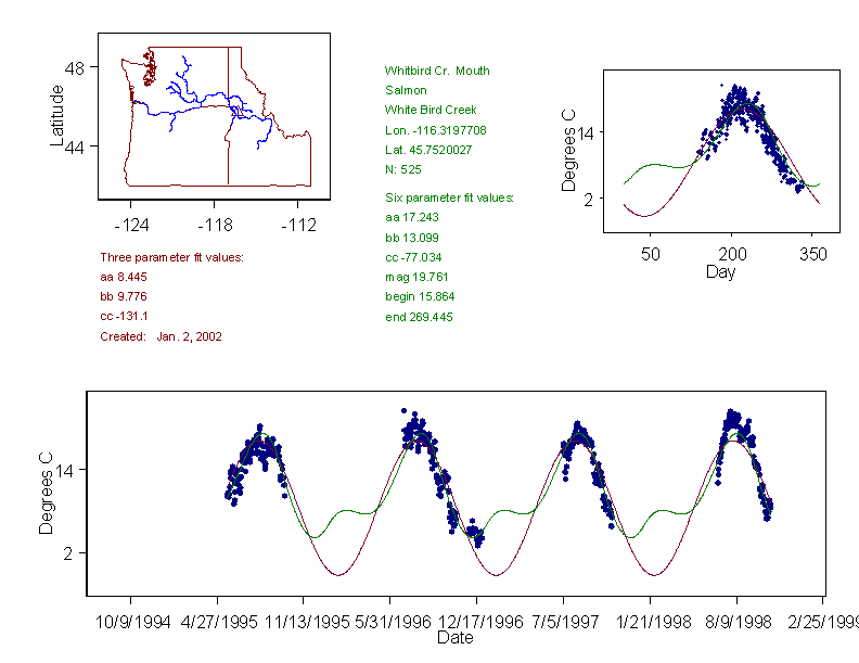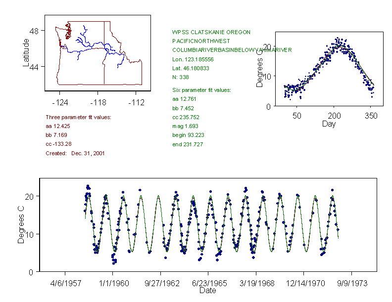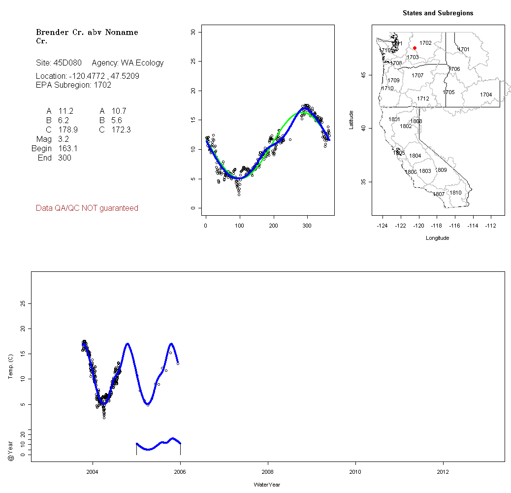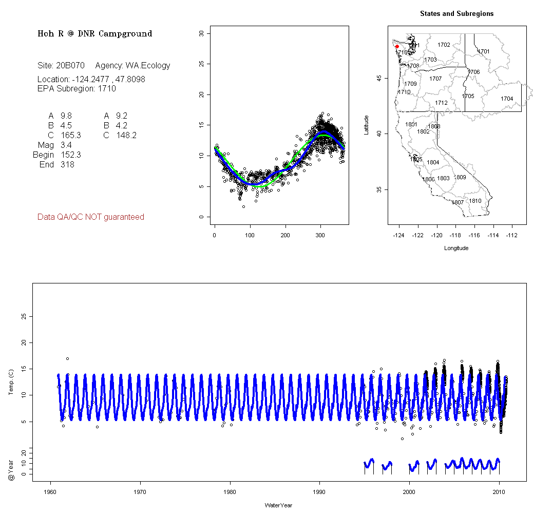 Historical data depicted in these plots are from various sources: California Data Exchange Center, USGS National Water Information System, WA Department of Ecology, EPA STORET, and StreamNet. Attempts were made to fit two sinusoidal curves through the data. One with 6 parameters and the other with 3 parameters. The non-linear solver function in the software package R (2.11.1 and later) was used for this purpose. The intention of the 6 parameter model is to allow for spring-time snowmelt effects on the temperature profile to be recognized where appropriate. However, not all of the streams have snowmelt contributions and many have significant anthropogenic influences. Click here for details on the 6 parameter model. It has been used to model temperatures in select streams.