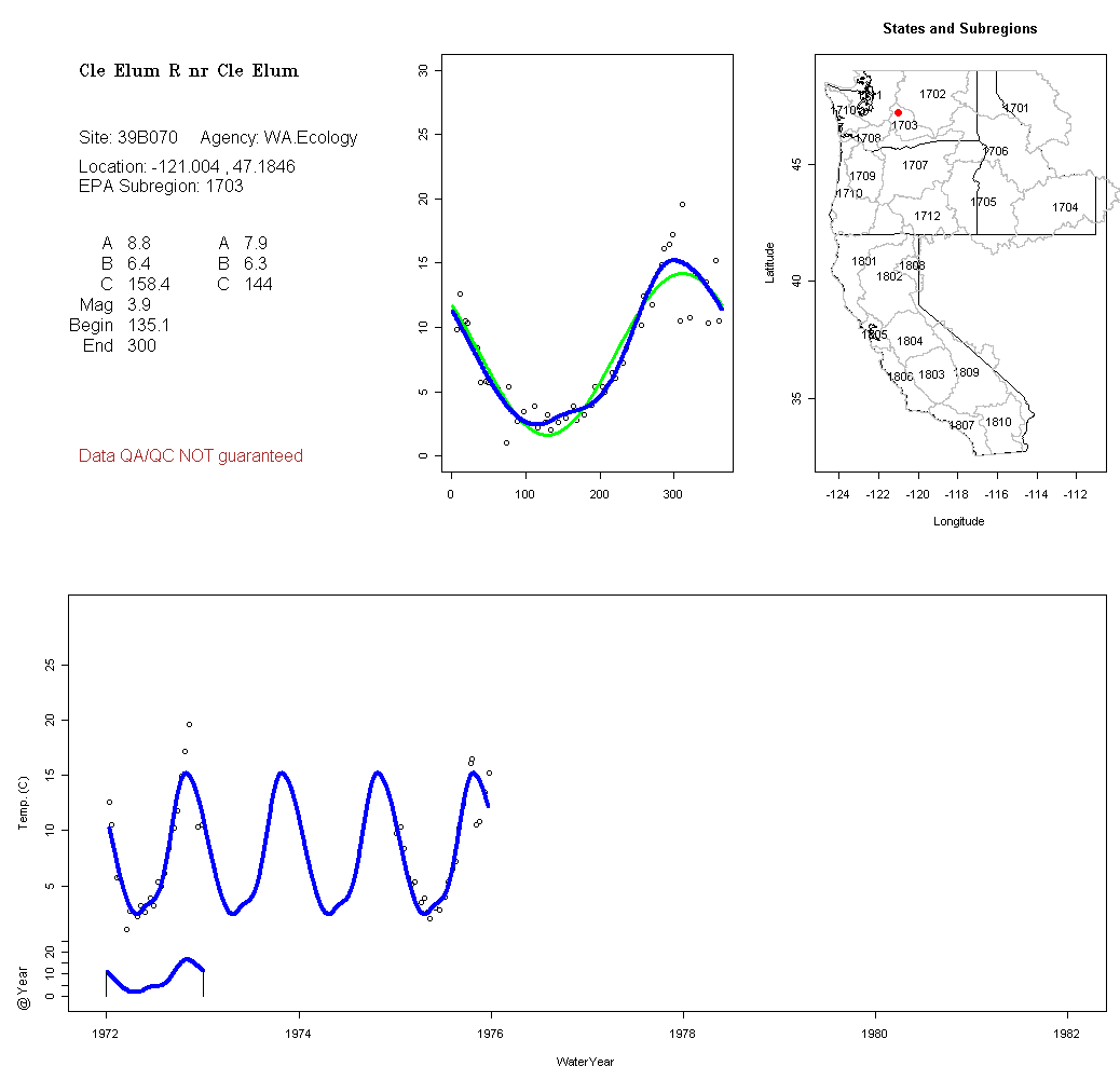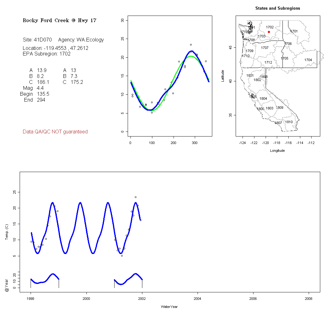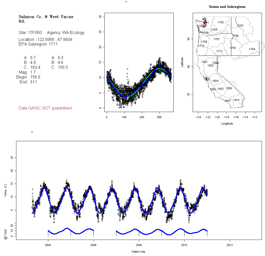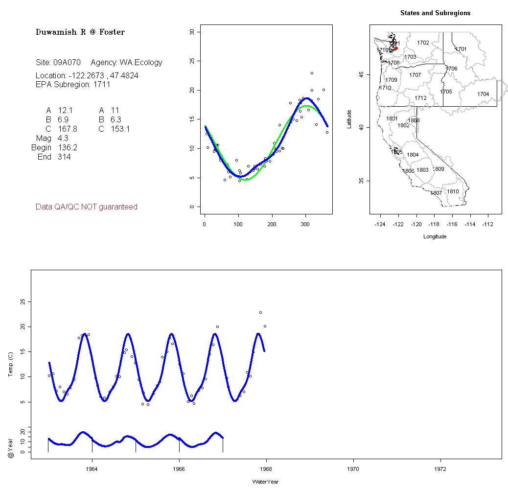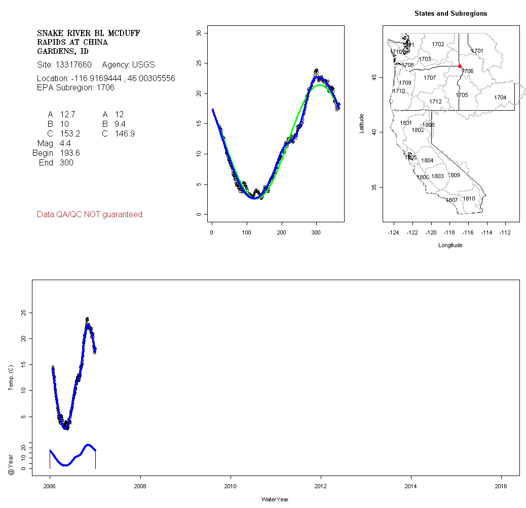 Historical data depicted in these plots are from various sources: California Data Exchange Center, USGS National Water Information System, WA Department of Ecology, EPA STORET, and StreamNet. Attempts were made to fit two sinusoidal curves through the data. One with 6 parameters and the other with 3 parameters. The non-linear solver function in the software package R (2.11.1 and later) was used for this purpose. The intention of the 6 parameter model is to allow for spring-time snowmelt effects on the temperature profile to be recognized where appropriate. However, not all of the streams have snowmelt contributions and many have significant anthropogenic influences. Click here for details on the 6 parameter model. It has been used to model temperatures in select streams.