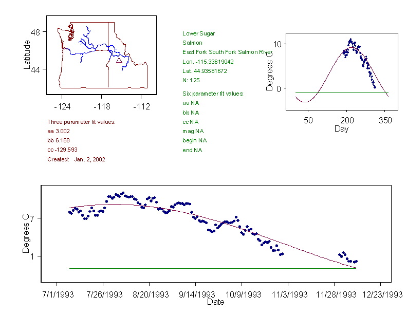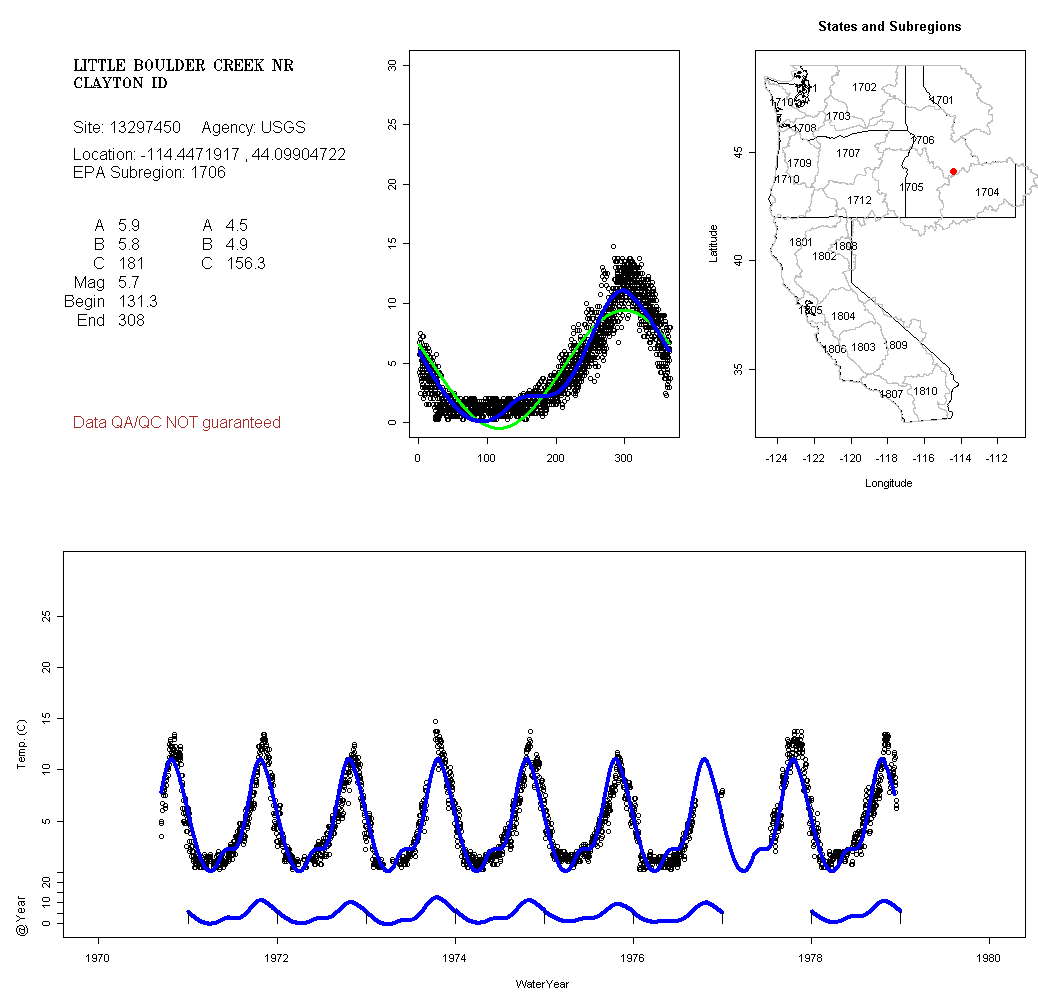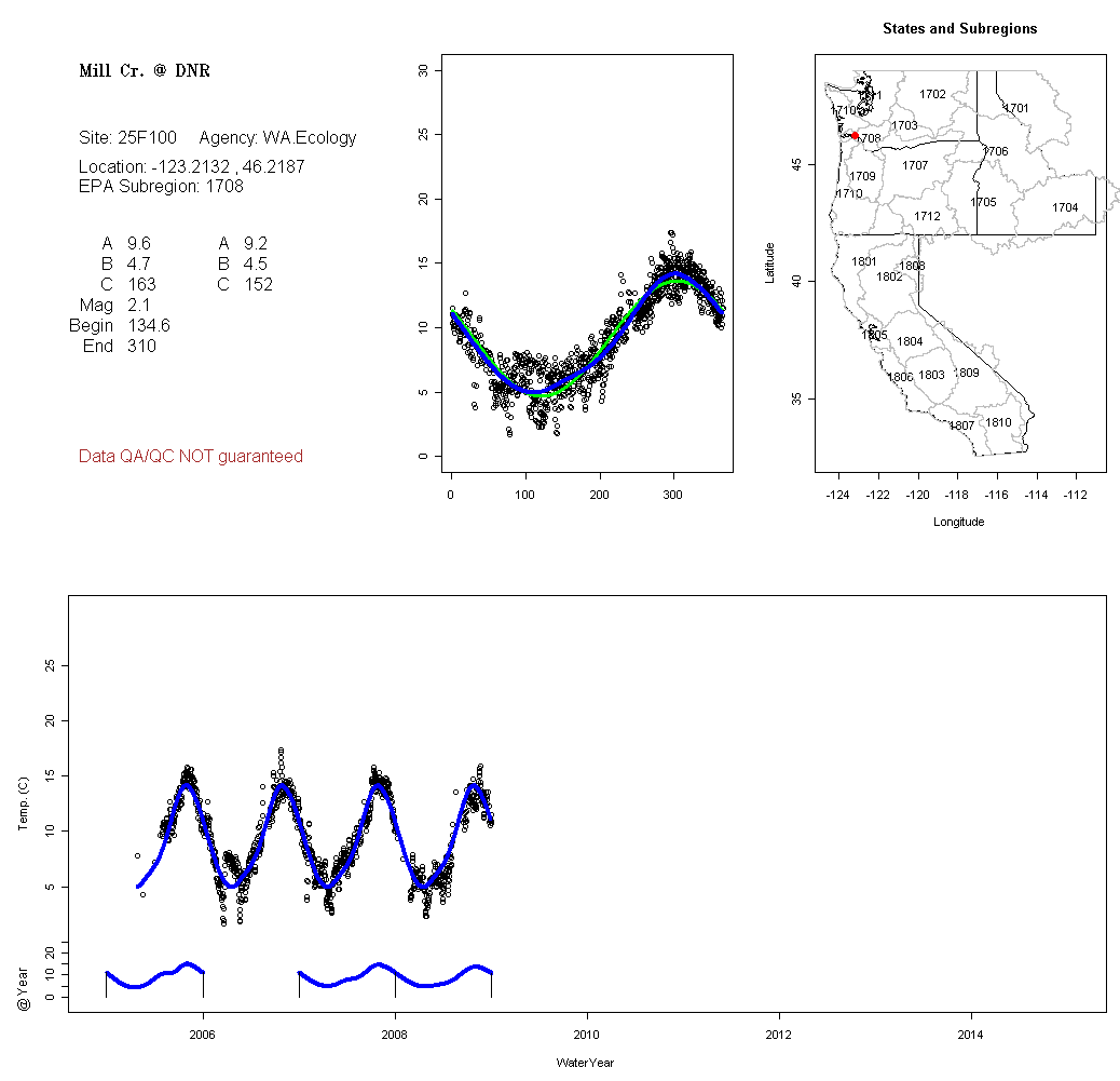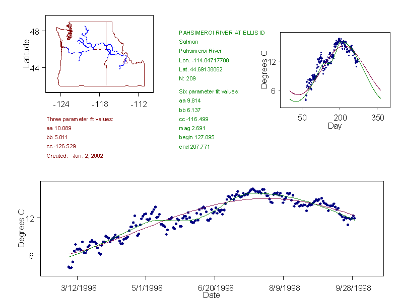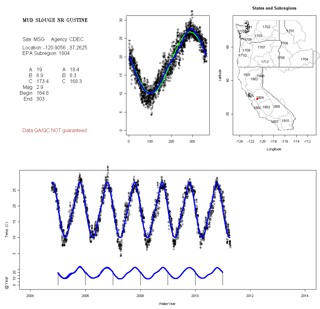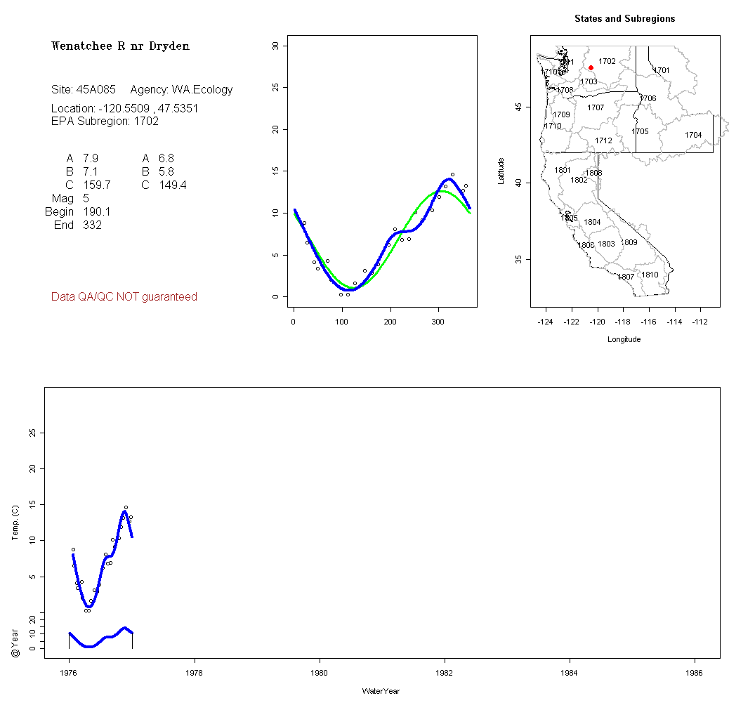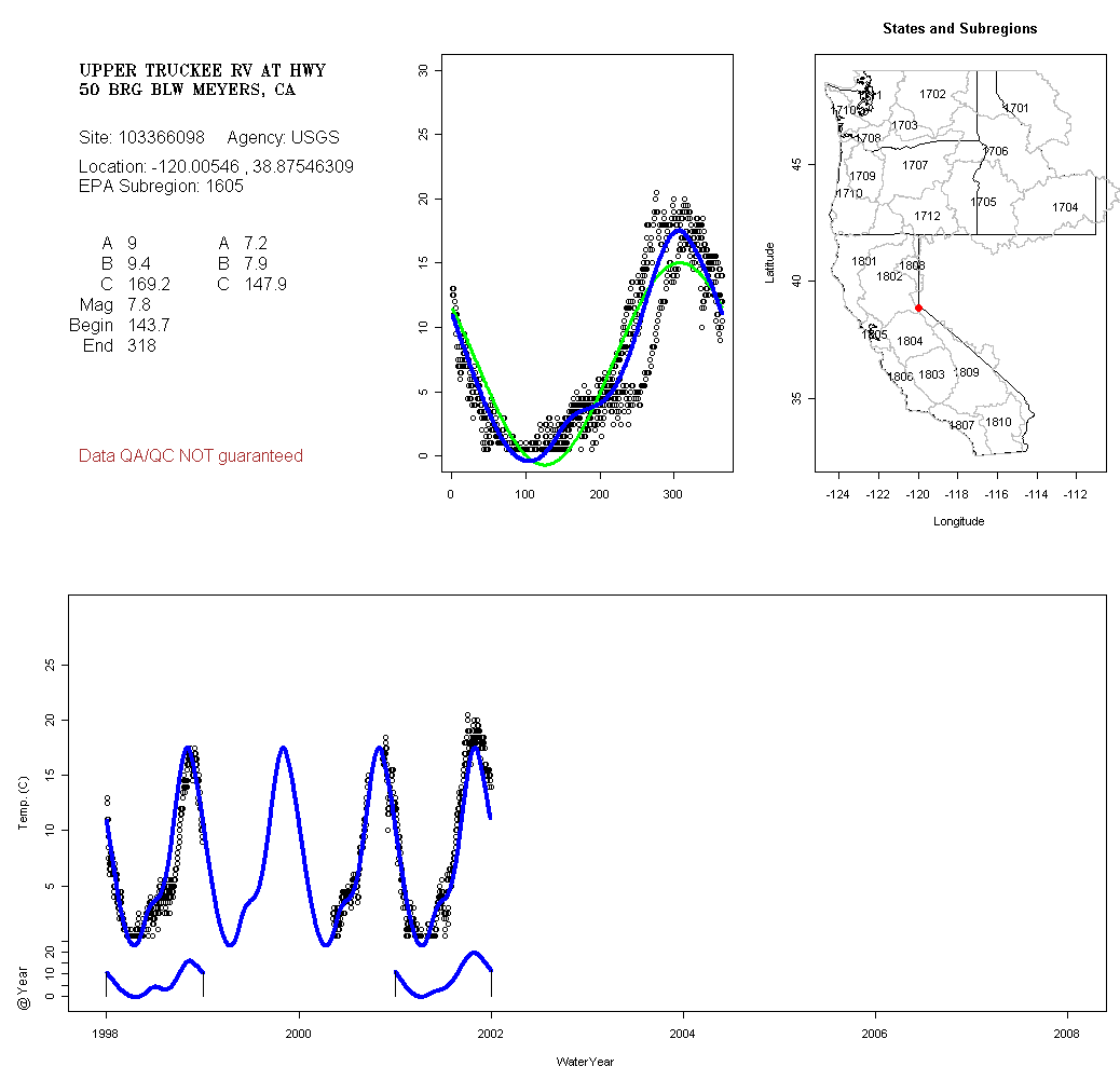 Historical data depicted in these plots are from various sources: California Data Exchange Center, USGS National Water Information System, WA Department of Ecology, EPA STORET, and StreamNet. Attempts were made to fit two sinusoidal curves through the data. One with 6 parameters and the other with 3 parameters. The non-linear solver function in the software package R (2.11.1 and later) was used for this purpose. The intention of the 6 parameter model is to allow for spring-time snowmelt effects on the temperature profile to be recognized where appropriate. However, not all of the streams have snowmelt contributions and many have significant anthropogenic influences. Click here for details on the 6 parameter model. It has been used to model temperatures in select streams.