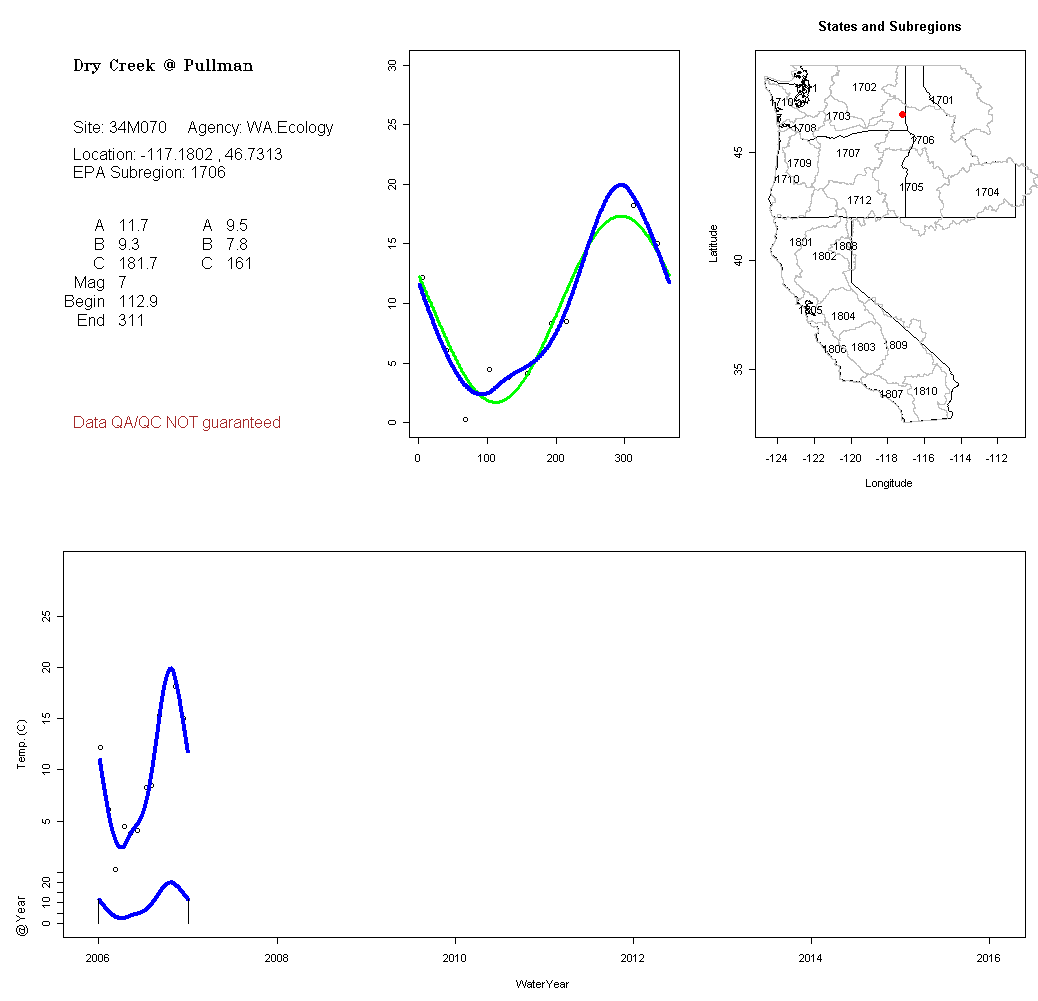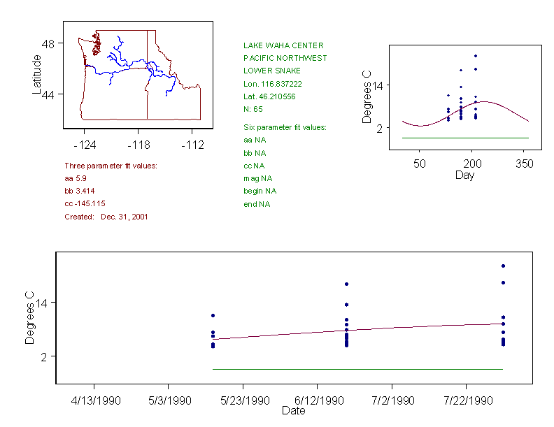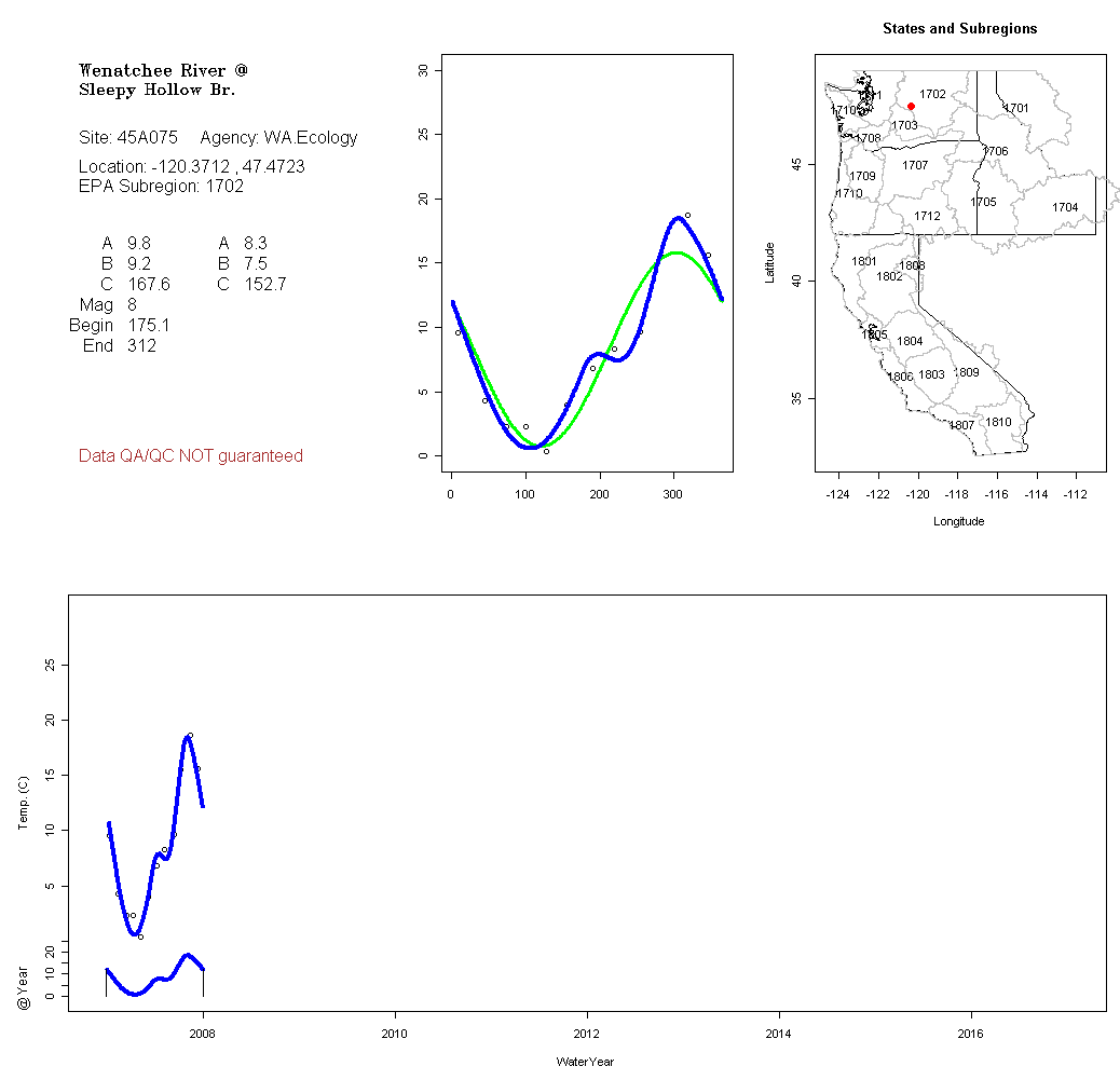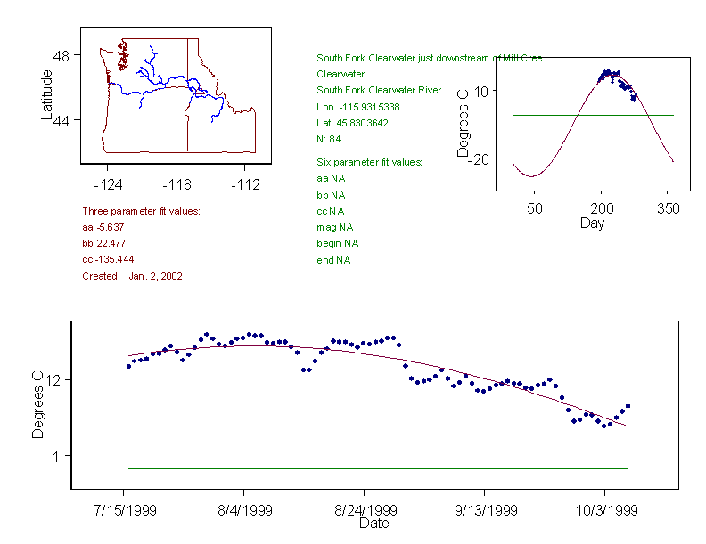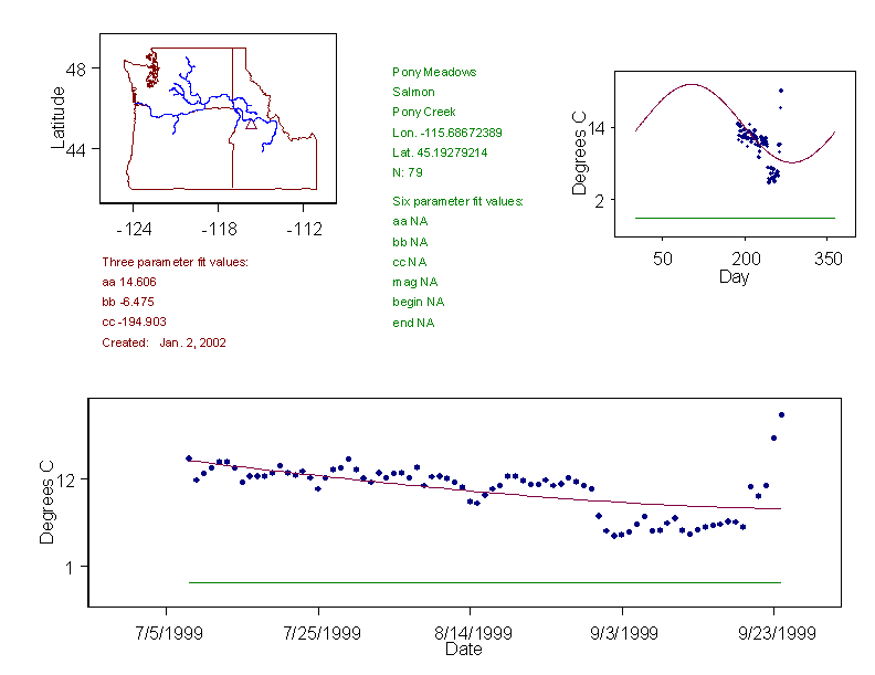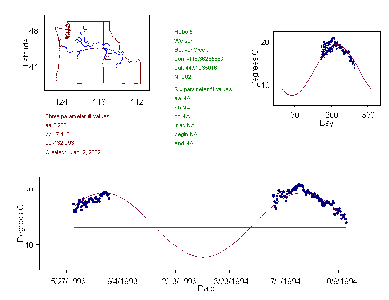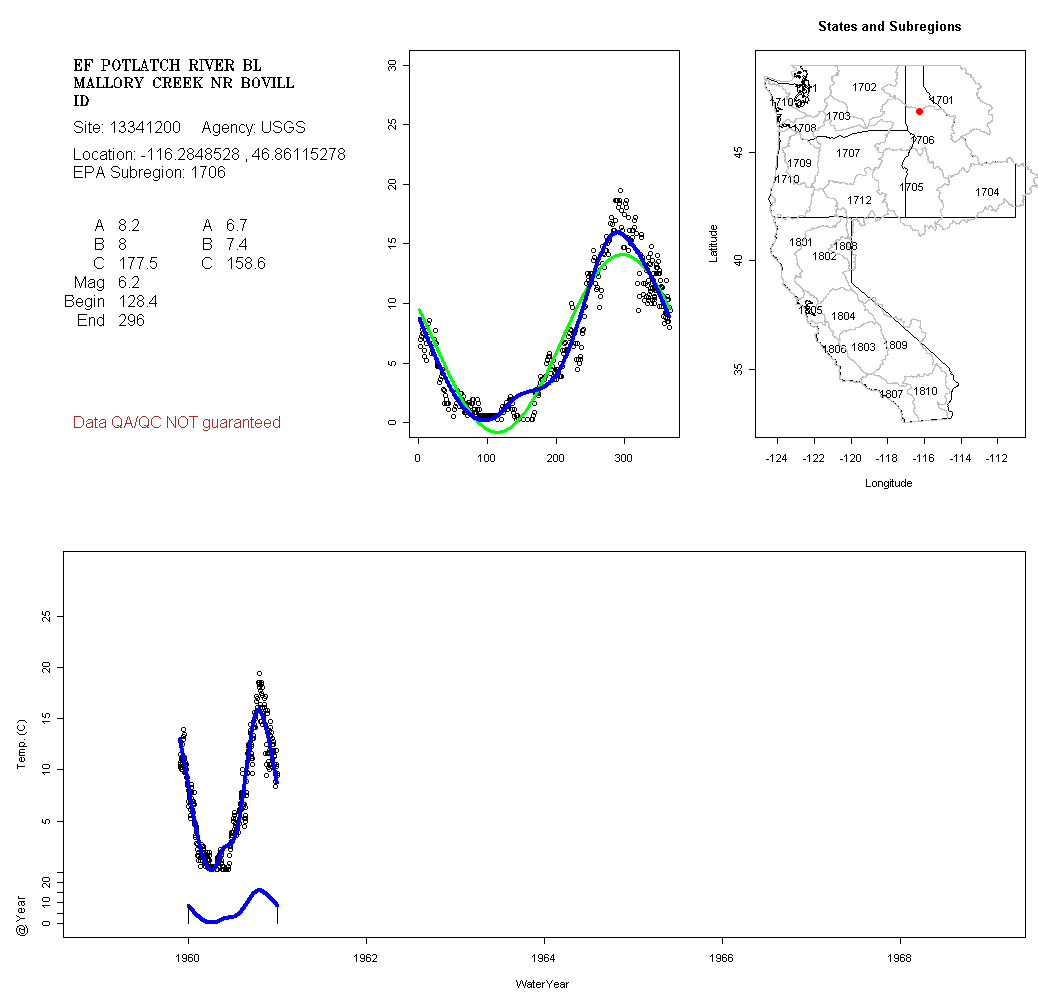 Historical data depicted in these plots are from various sources: California Data Exchange Center, USGS National Water Information System, WA Department of Ecology, EPA STORET, and StreamNet. Attempts were made to fit two sinusoidal curves through the data. One with 6 parameters and the other with 3 parameters. The non-linear solver function in the software package R (2.11.1 and later) was used for this purpose. The intention of the 6 parameter model is to allow for spring-time snowmelt effects on the temperature profile to be recognized where appropriate. However, not all of the streams have snowmelt contributions and many have significant anthropogenic influences. Click here for details on the 6 parameter model. It has been used to model temperatures in select streams.