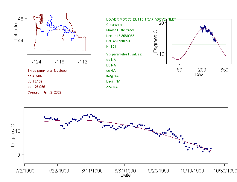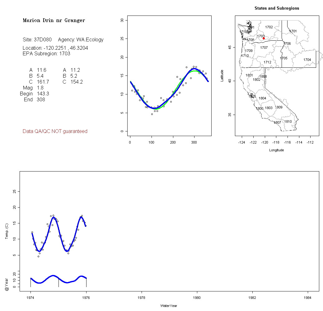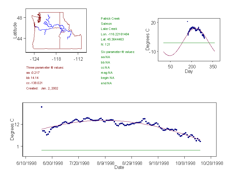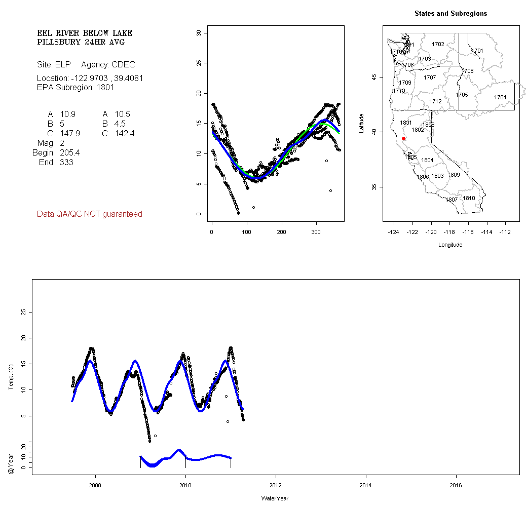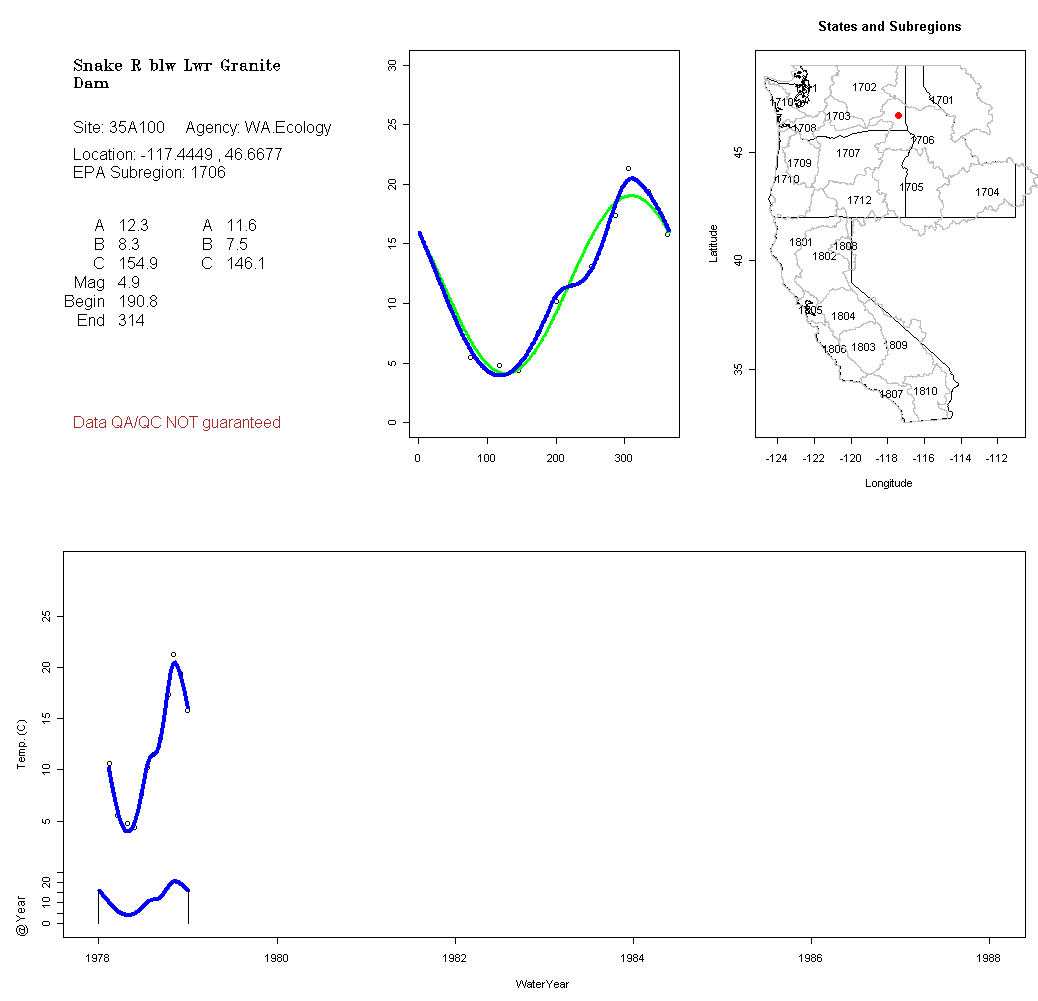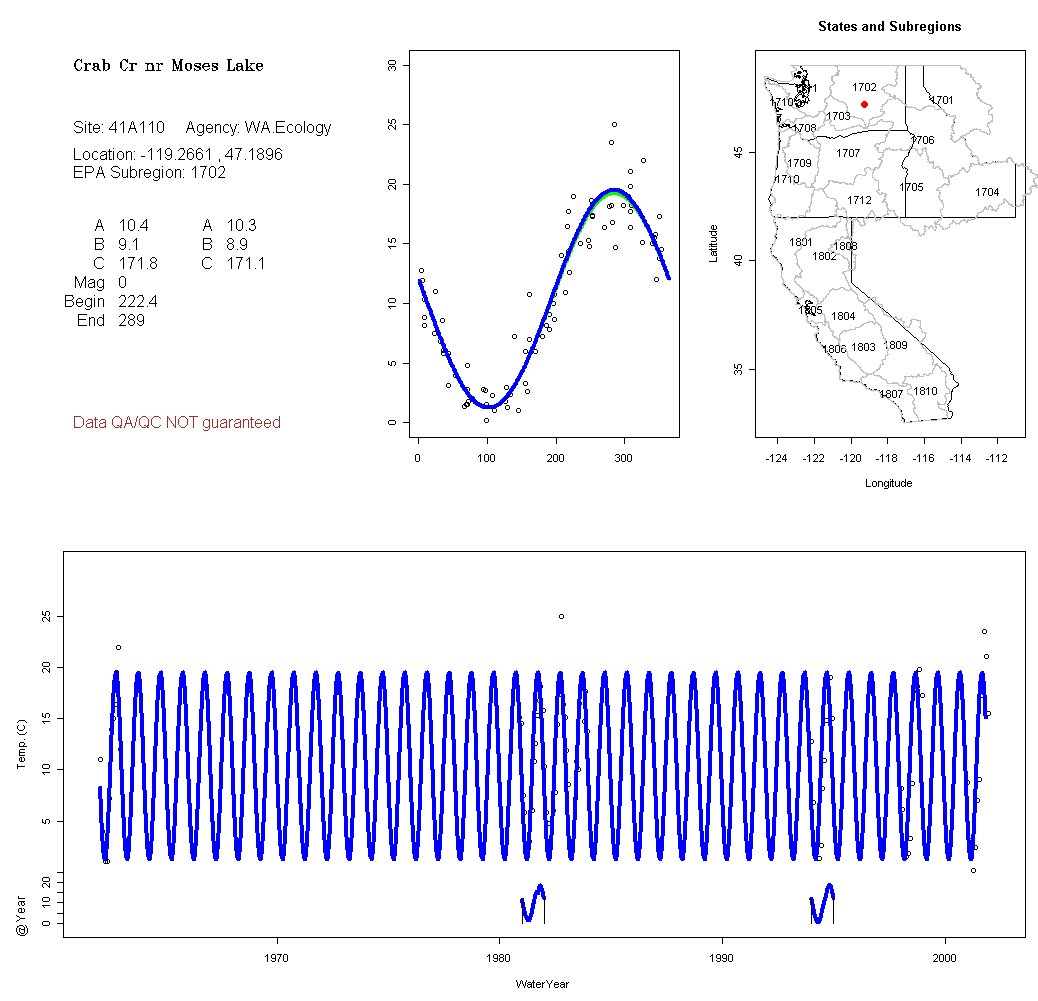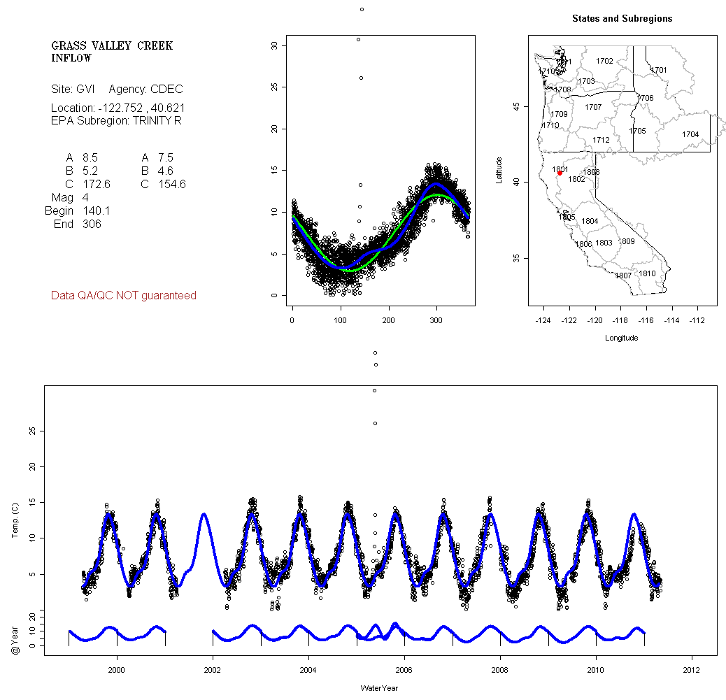 Historical data depicted in these plots are from various sources: California Data Exchange Center, USGS National Water Information System, WA Department of Ecology, EPA STORET, and StreamNet. Attempts were made to fit two sinusoidal curves through the data. One with 6 parameters and the other with 3 parameters. The non-linear solver function in the software package R (2.11.1 and later) was used for this purpose. The intention of the 6 parameter model is to allow for spring-time snowmelt effects on the temperature profile to be recognized where appropriate. However, not all of the streams have snowmelt contributions and many have significant anthropogenic influences. Click here for details on the 6 parameter model. It has been used to model temperatures in select streams.